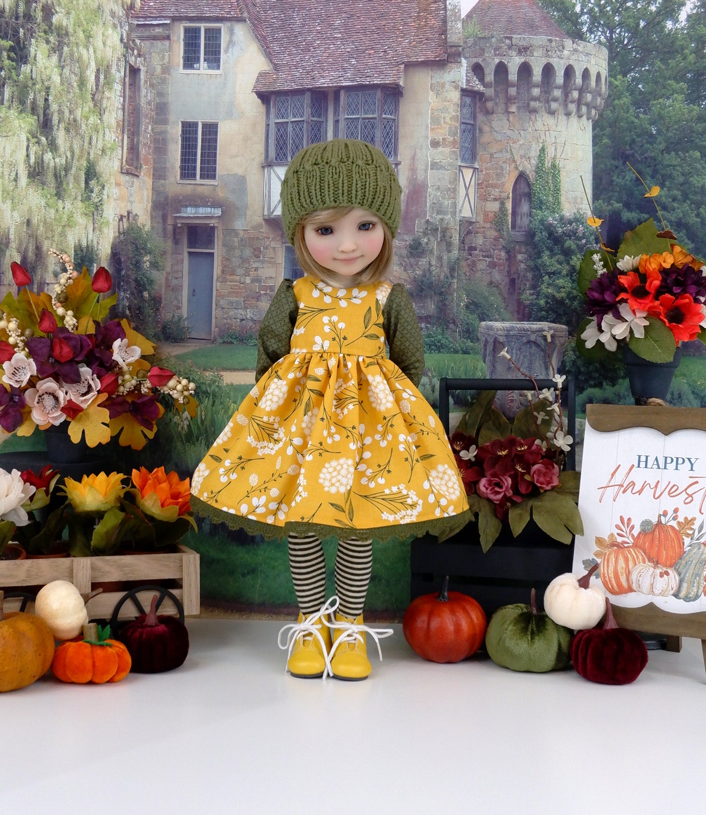 This beautiful ensemble will make a great addition to your Fashion Friend's closet for this Autumn. The dress is made of a delightful dandelion print with wishes scattered about on marigold cotton. The bodice is fully lined with long, full length contrast loden green diamond print sleeves featuring a bit of elastic at the wrist. The skirt is gathered at the waist for a pretty silhouette with loden green crochet lace peeking out beneath the hem. The dress fastens in back with buttons. To add to the charm of her outfit, she has a knit hat. Her knitwear is made of high quality loden green yarn.