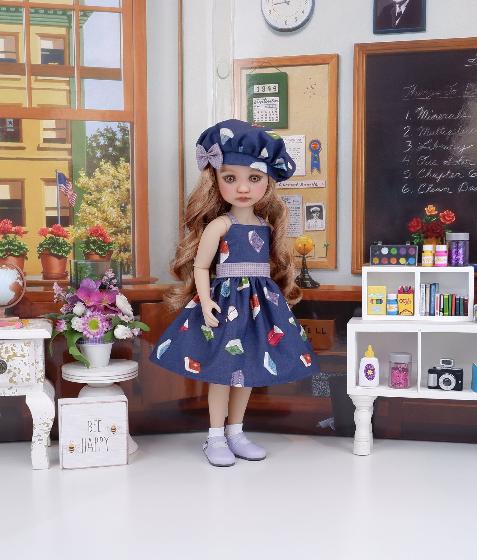 This charming sundress ensemble is a great addition to any Ruby Red Fashion Friend's wardrobe. The sundress is made of a lovely book print in dusty lilac, green, crimson and blue on dark blue cotton. The bodice has tiny contrast dusty lilac square print straps at the shoulders and is fully lined. The contrast waistband is also made of square print cotton. The skirt is full and gathered at the waist for a wonderful silhouette. The dress fastens in back with buttons. Finish the look off with the matching hat. The fully lined beret is made of library print cotton with a dusty lilac square print bow embellishing the hat band.