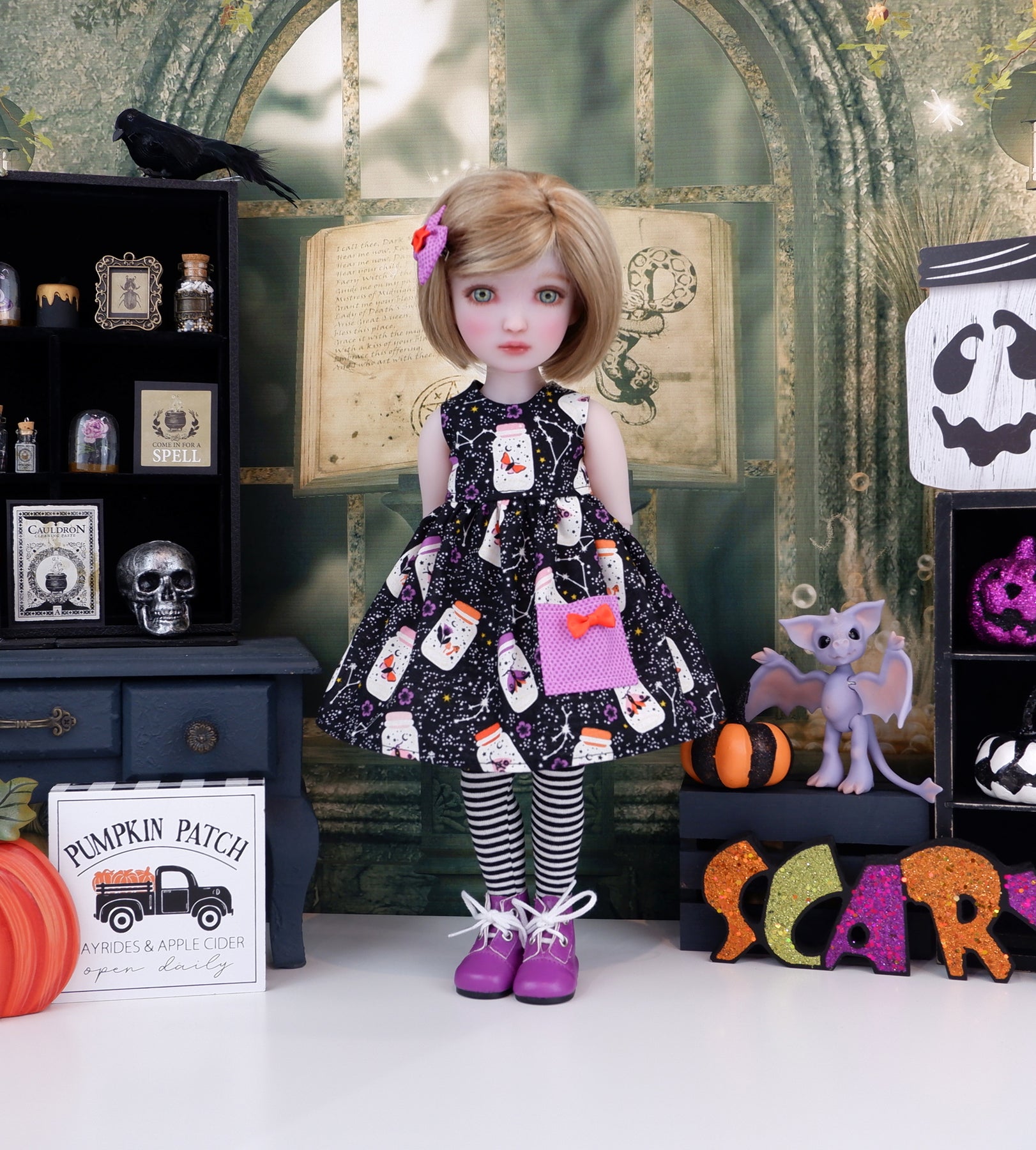 This cute babydoll dress ensemble is a great addition to any Ruby Red Fashion Friend's wardrobe for this Halloween. The dress is made of a spooky mason jar with moths in purple and orange on black constellation print cotton. The sleeveless bodice is fully lined with a babydoll waistline. The skirt is gathered at the waist for a pretty silhouette with a contrast orchid polka dot print cotton pocket adorned with an orange ribbon bow. The dress fastens in back with a button covered snap. Add the matching hair clip for an easy hairstyle. An orchid polka dot print cotton fabric bow is adorned with an orange ribbon bow.