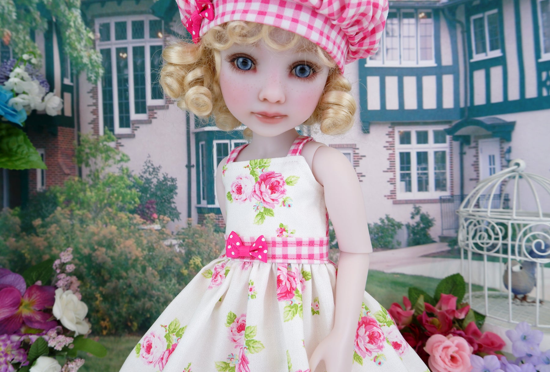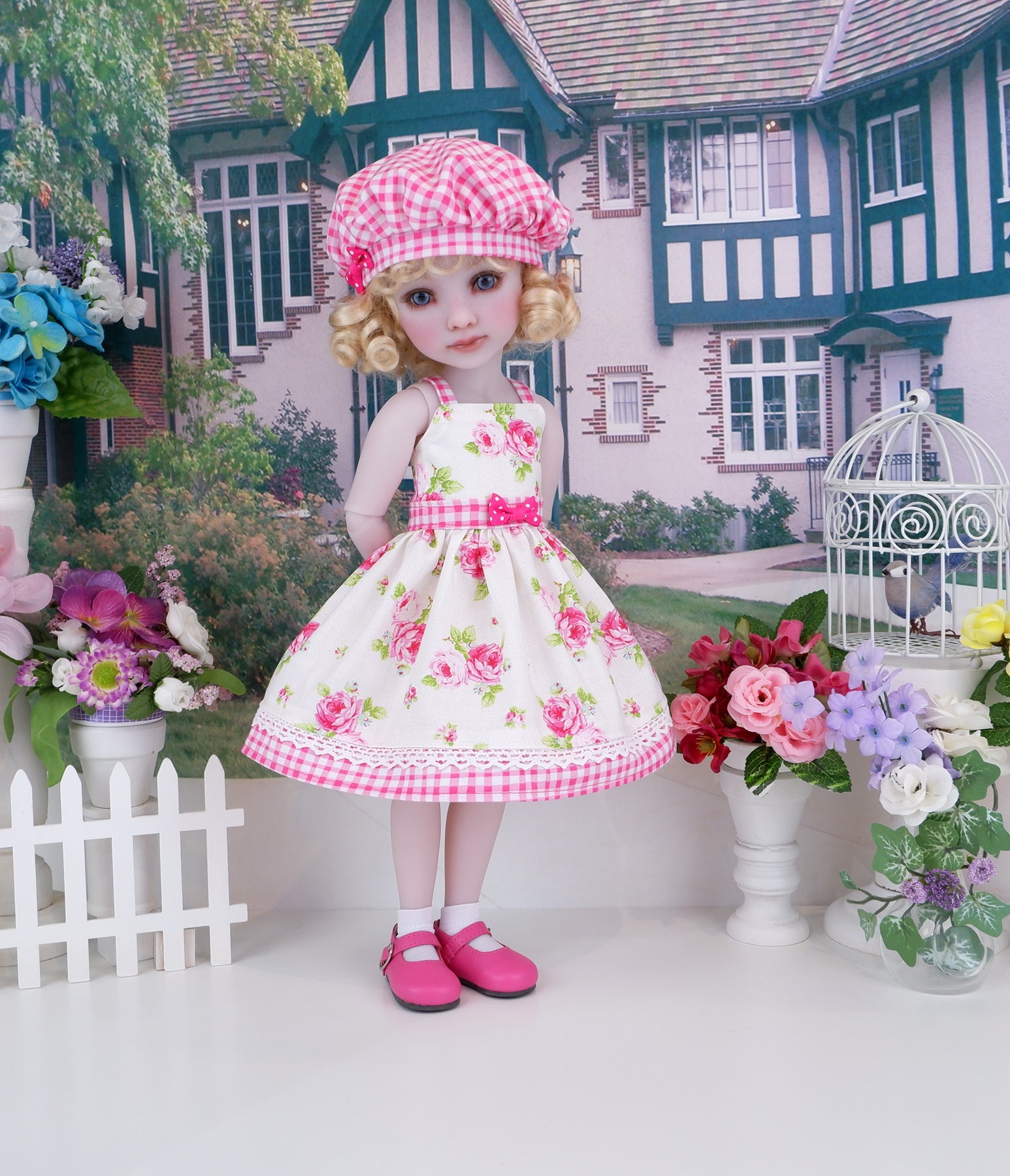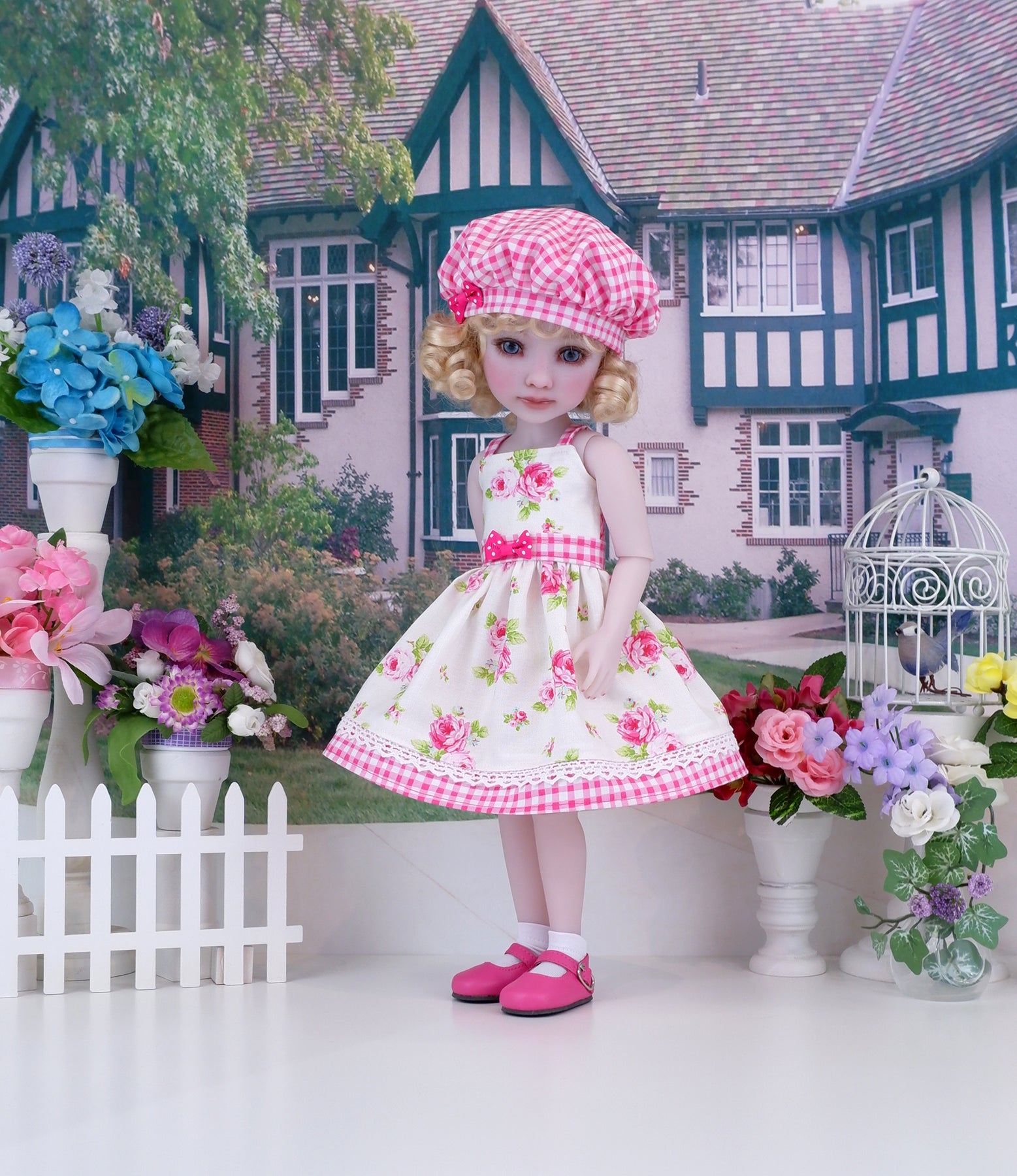 This gorgeous sundress ensemble is a great addition to any Ruby Red Fashion Friend's wardrobe. The sundress is made of a beautiful bright pink rose print on white cotton. The bodice has tiny contrast dark pink gingham print straps at the shoulders and is fully lined. The contrast waistband is also made of gingham print cotton. A dark pink polka dot ribbon bow adorns the waist. The skirt is full and gathered at the waist for a wonderful silhouette with an inset of white crochet lace above the contrast band of dark pink gingham print cotton at the hem. The dress fastens in back with buttons. Finish the look off with the matching hat. The fully lined beret is made of dark pink gingham print cotton with a dark pink polka dot ribbon bow embellishing the hat brim.