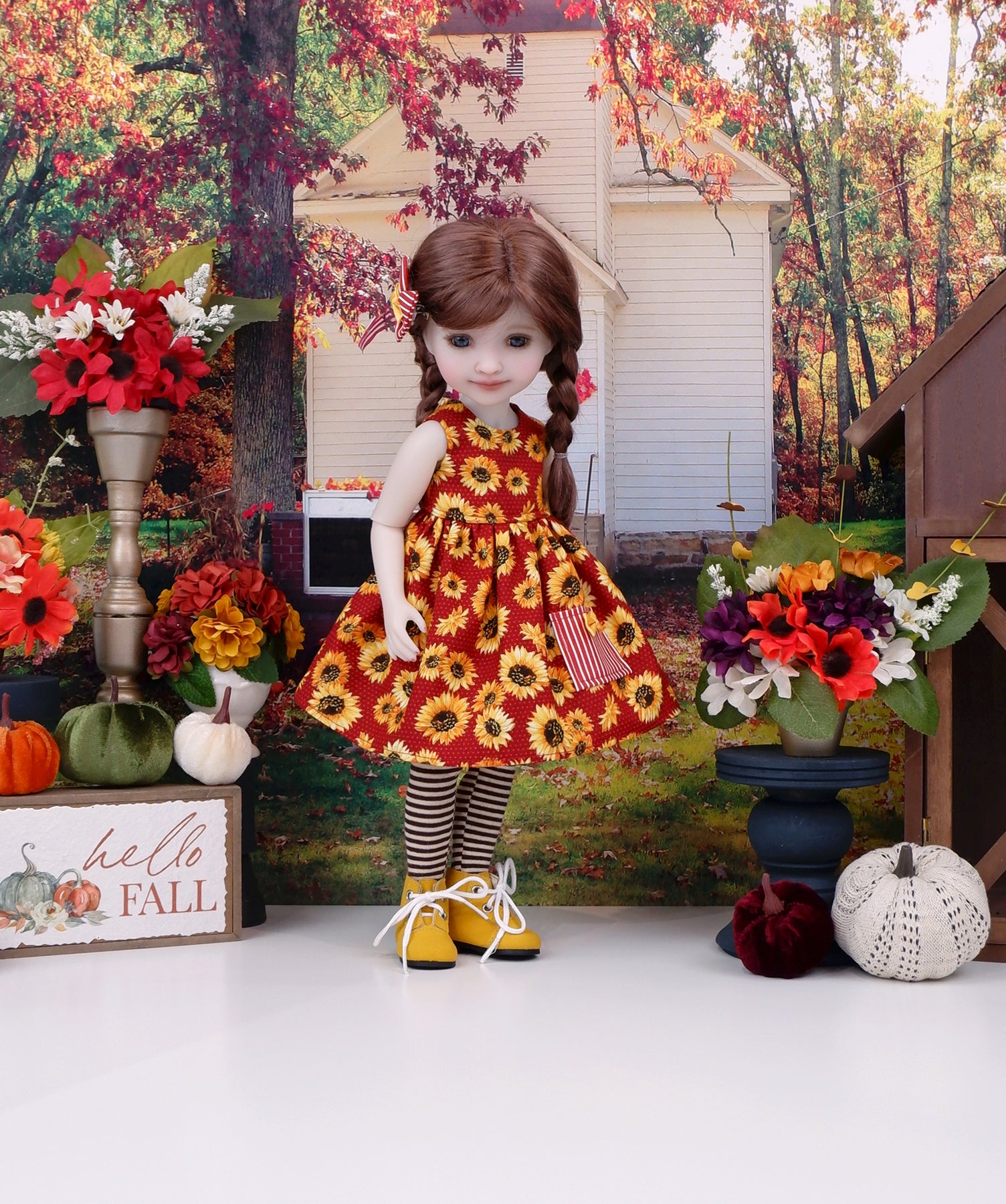This beautiful babydoll dress ensemble is a great addition to any Ruby Red Fashion Friend's wardrobe for this fall. The dress is made of a lovely sunflower print on brick red polka dot cotton. The sleeveless bodice is fully lined with a babydoll waistline. The skirt is gathered at the waist for a pretty silhouette with a contrast brick red stripe print cotton pocket adorned with a marigold ribbon bow. The dress fastens in back with a button covered snap. Add the matching hair clip for an easy hairstyle. A stripe cotton fabric bow is adorned with a marigold ribbon bow.