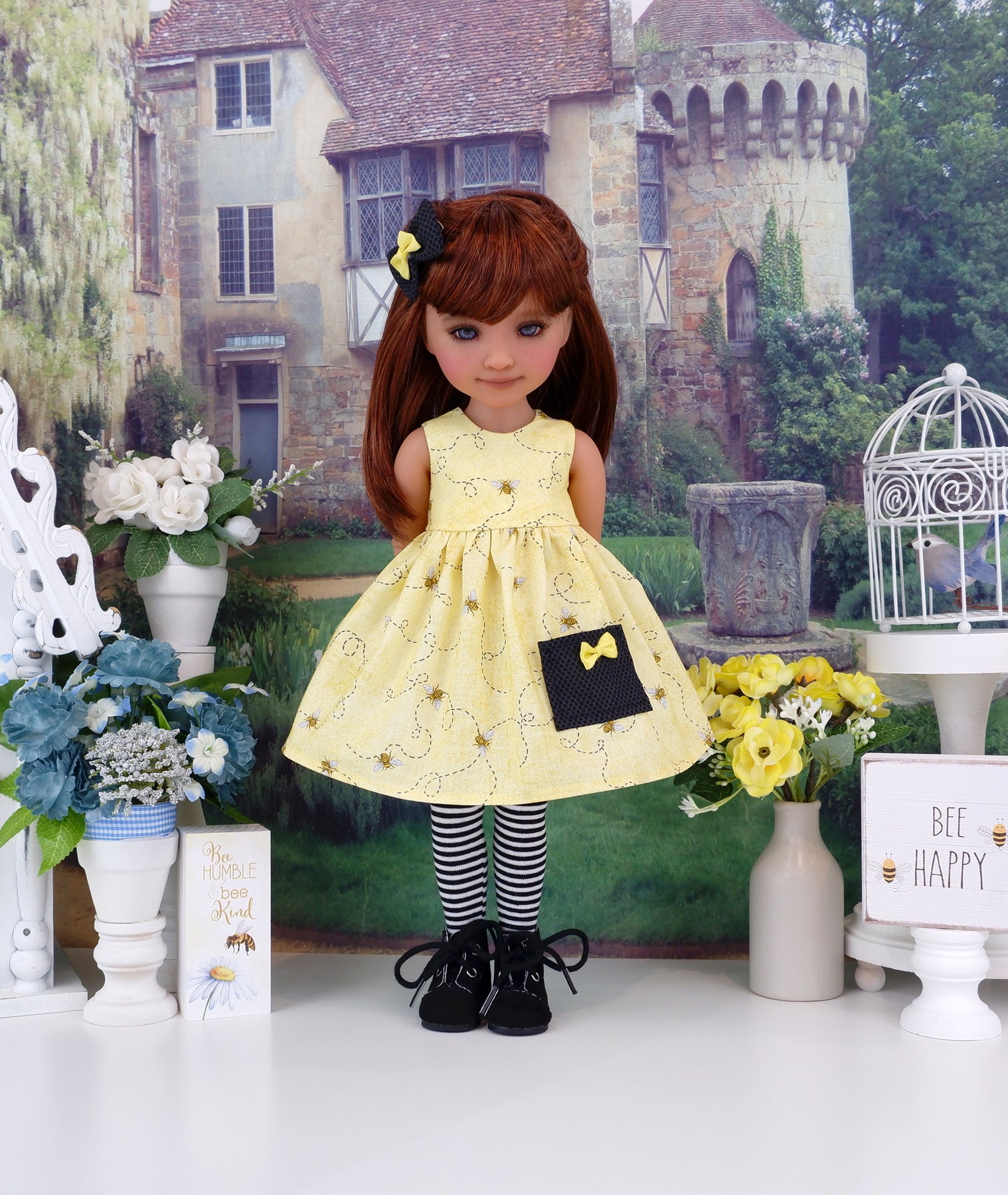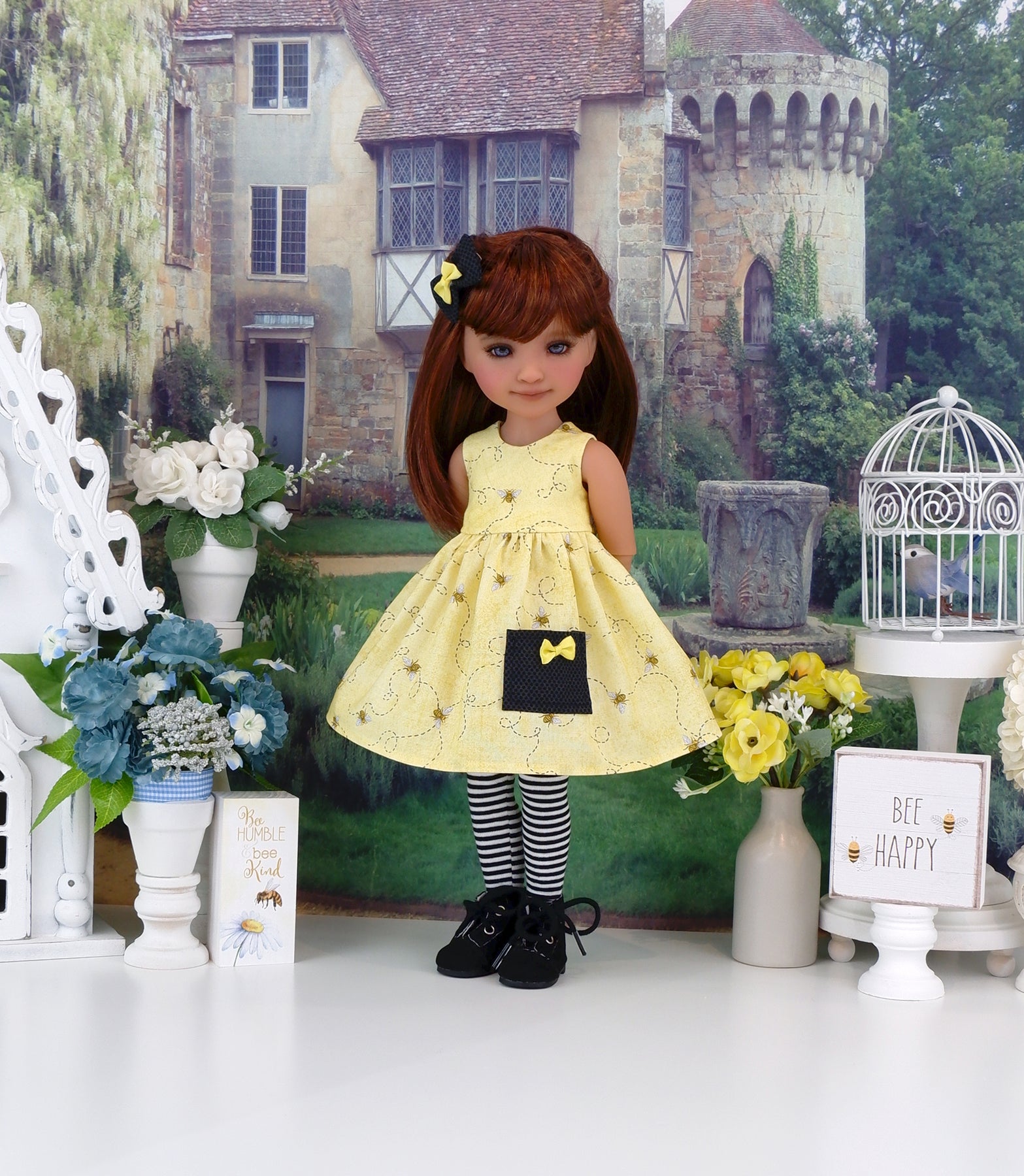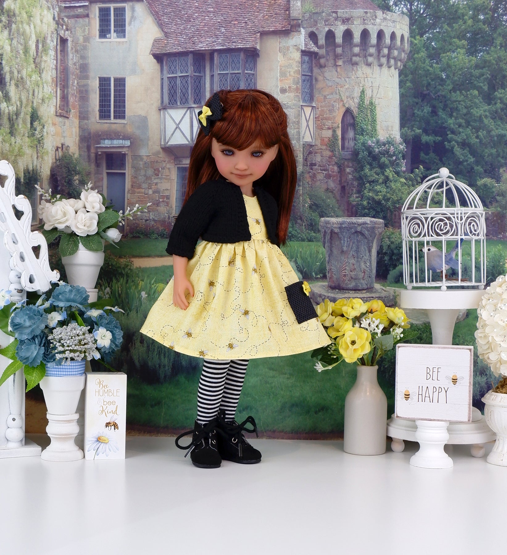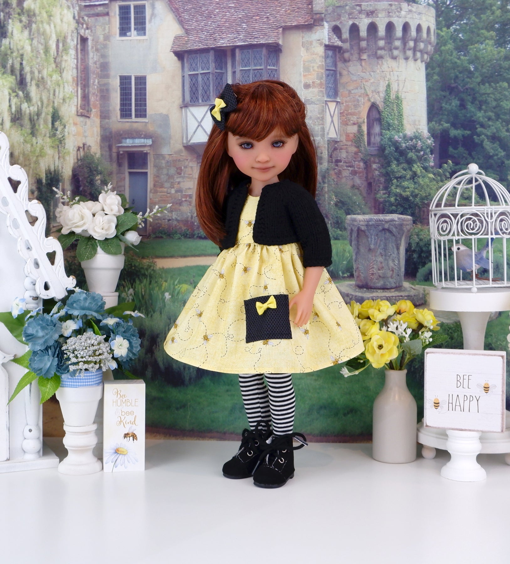 This adorable babydoll dress and sweater ensemble is a great addition to any Ruby Red Fashion Friend's wardrobe. The dress is made of a little bee print in black on yellow cotton. The sleeveless bodice is fully lined with a babydoll waistline. The skirt is gathered at the waist for a pretty silhouette with a contrast black polka dot print cotton pocket adorned with a yellow ribbon bow. The dress fastens in back with a button covered snap. Add the matching hair clip for an easy hairstyle. A black polka dot cotton fabric bow is adorned with a yellow ribbon bow. Wear alone or pair with the simple sweater. The sweater is made of high quality black yarn with 3/4 sleeves.