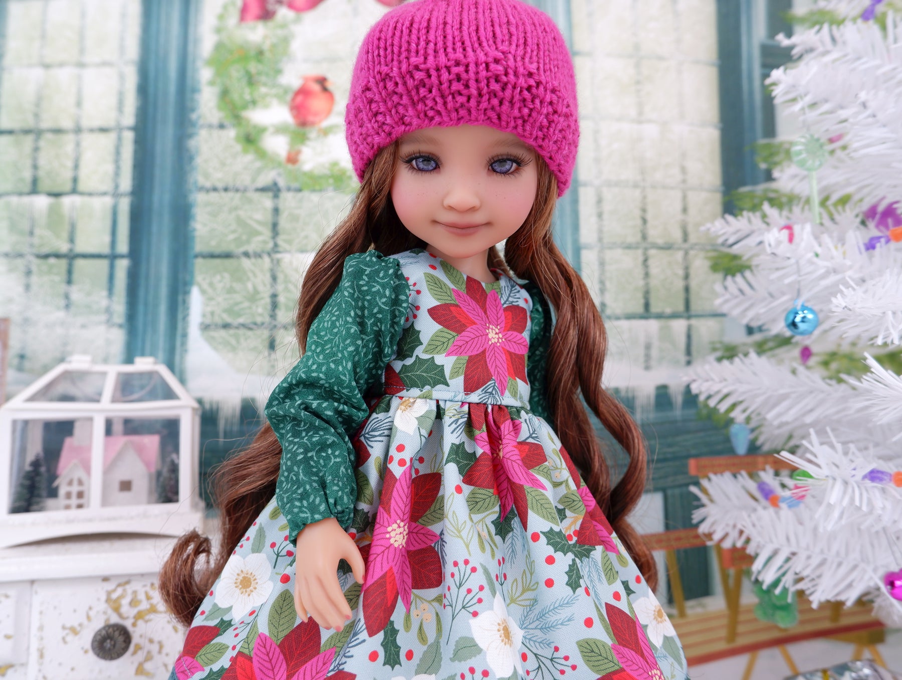 This beautiful ensemble will make a great addition to your Fashion Friend's closet for this Christmastime. The dress is made of a pretty fuchsia poinsettia print on aqua cotton. The bodice is fully lined with long, full length contrast evergreen leaf print sleeves featuring a bit of elastic at the wrist. The skirt is gathered at the waist for a lovely silhouette with evergreen crochet lace over fuchsia crochet lace peeking out beneath the hem. The dress fastens in back with buttons. To add to the charm of her outfit, she has a knit hat. Her knitwear is made of high quality fuchsia yarn.
