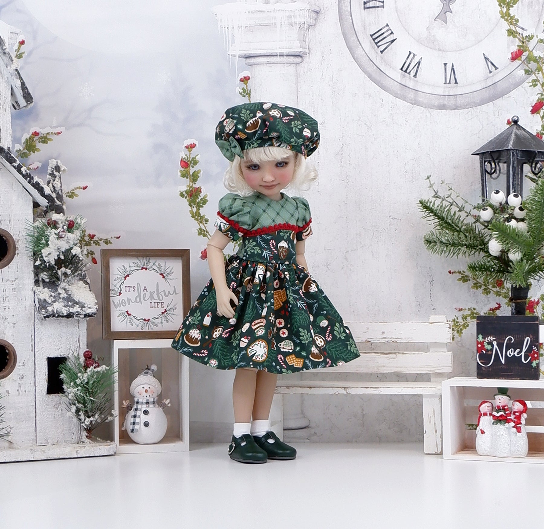 This darling dress is a great addition to any Fashion Friend's wardrobe for this Christmas. The dress is made of a charming Christmas sweets print with cocoa, cake, candy canes and gingerbread on forest green cotton. The fully lined bodice is made of spurce plaid star print cotton with a contrast overlay of sweets print at the waist edged with cranberry pom pom trim. The short sleeves are also made of plaid star cotton gathered to a contrast band of cake print accented with cranberry pom pom trim above the elbow. The skirt is full and gathered at the waist for a wonderful silhouette. The dress fastens in back with buttons. Finish the look off with the matching hat. The fully lined beret is made of cocoa print cotton with a plaid star print cotton bow embellishing the hat brim.