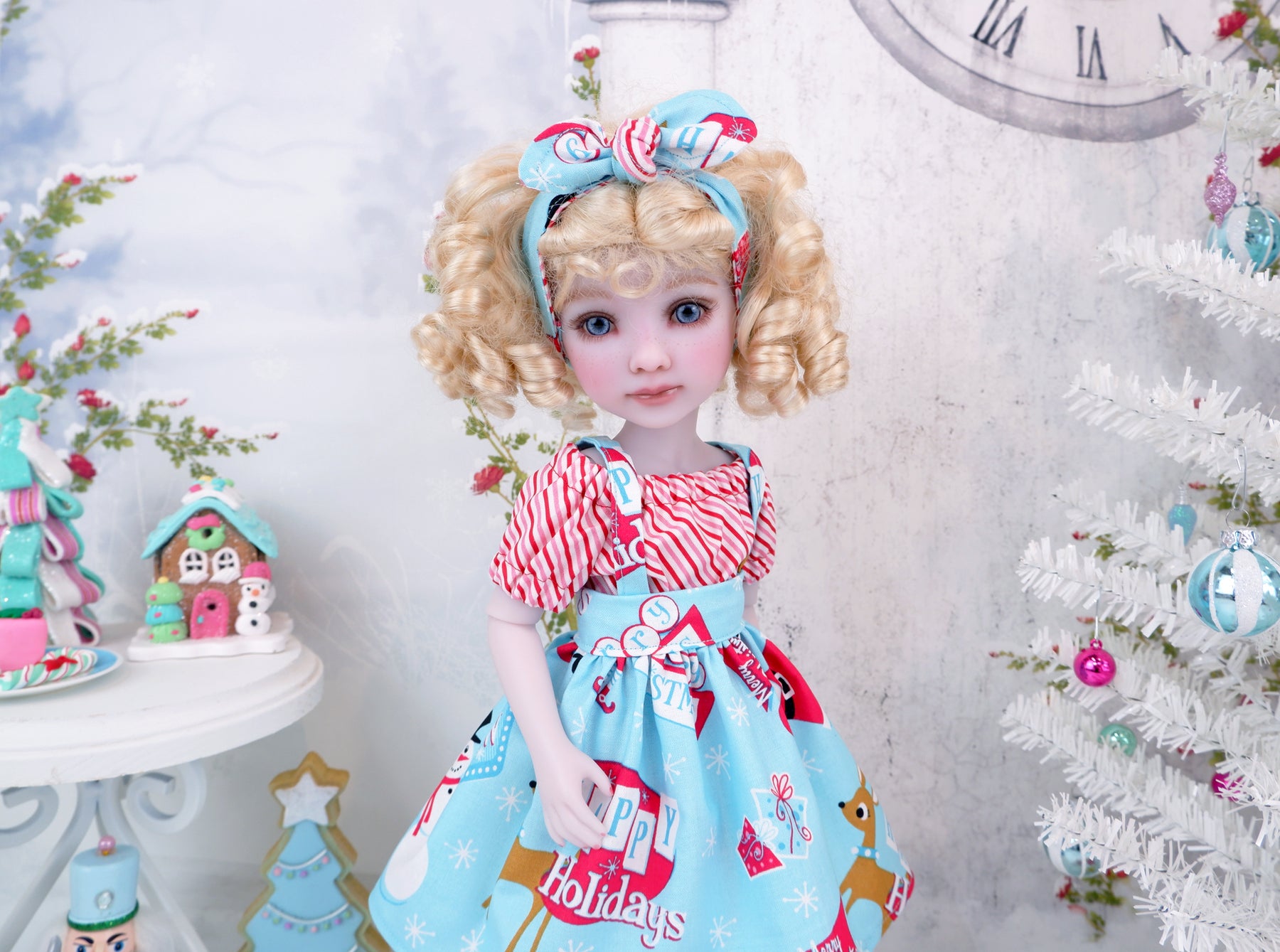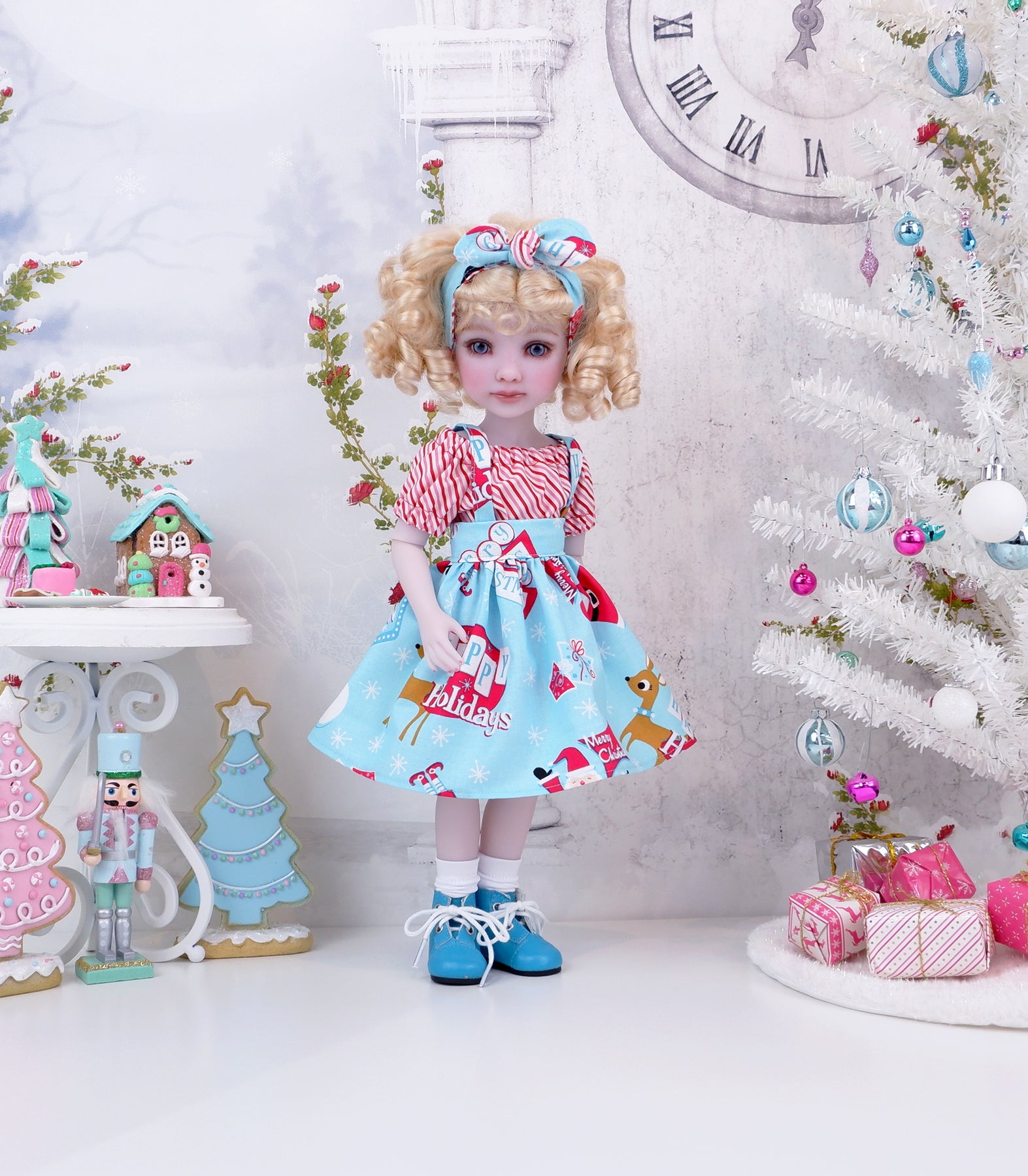 This charming ensemble will be a perfect addition to your Ruby Red Fashion Friend's wardrobe for celebrating this Christmas. The peasant blouse is made of pretty red and pink stripe print cotton. The blouse features elastic at the neckline for an over or across shoulder look. The short sleeves have elastic above the elbow. The shirt looks great bloused into the suspender jumper skirt. The jumper is made of a darling retro style Christmas print with Santa, reindeer and snowman in red, white and turquoise on aqua cotton. The skirt features straps that attach at the waist. The skirt fastens with a button covered snap at the waist band. Add the matching headband for a hair accessory. The retro style knot headband is made of Santa Claus & stripe print cottons and features elastic behind the neck for easy styling.