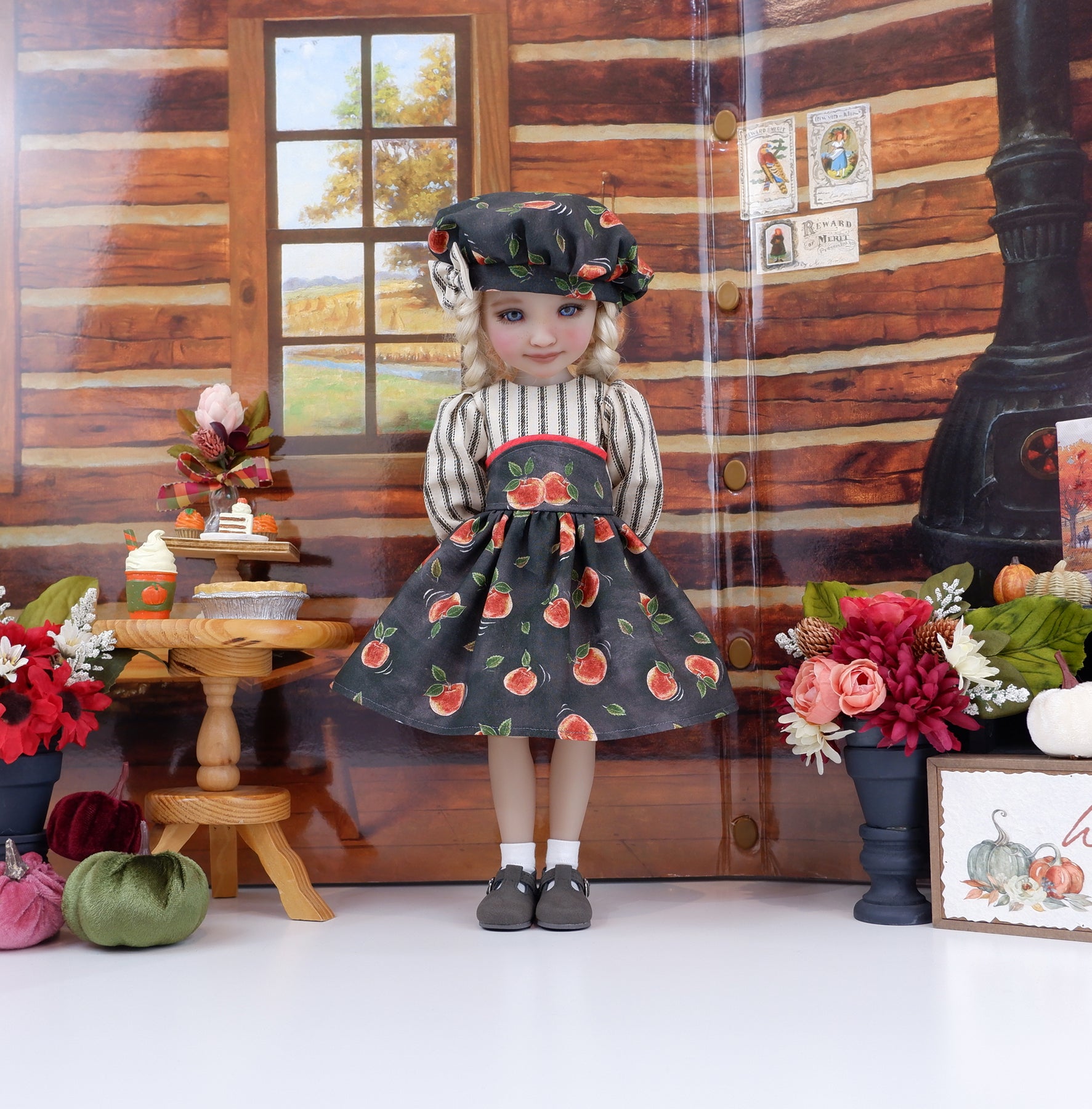 This beautiful dress is the perfect addition to any Fashion Friend's wardrobe. The dress is made of a charming red apple print on chalkboard cotton. The fully lined bodice is made of black stripe print on ivory cotton with a contrast overlay of apple print at the waist trimmed with a band of red print cotton. The long gathered sleeves have a bit of elastic at the wrist. The skirt is full and gathered at the waist for a wonderful silhouette. The dress fastens in back with buttons. Finish the look off with the matching hat. The fully lined beret is made of apple print cotton with a stripe fabric bow embellishing the hat band.