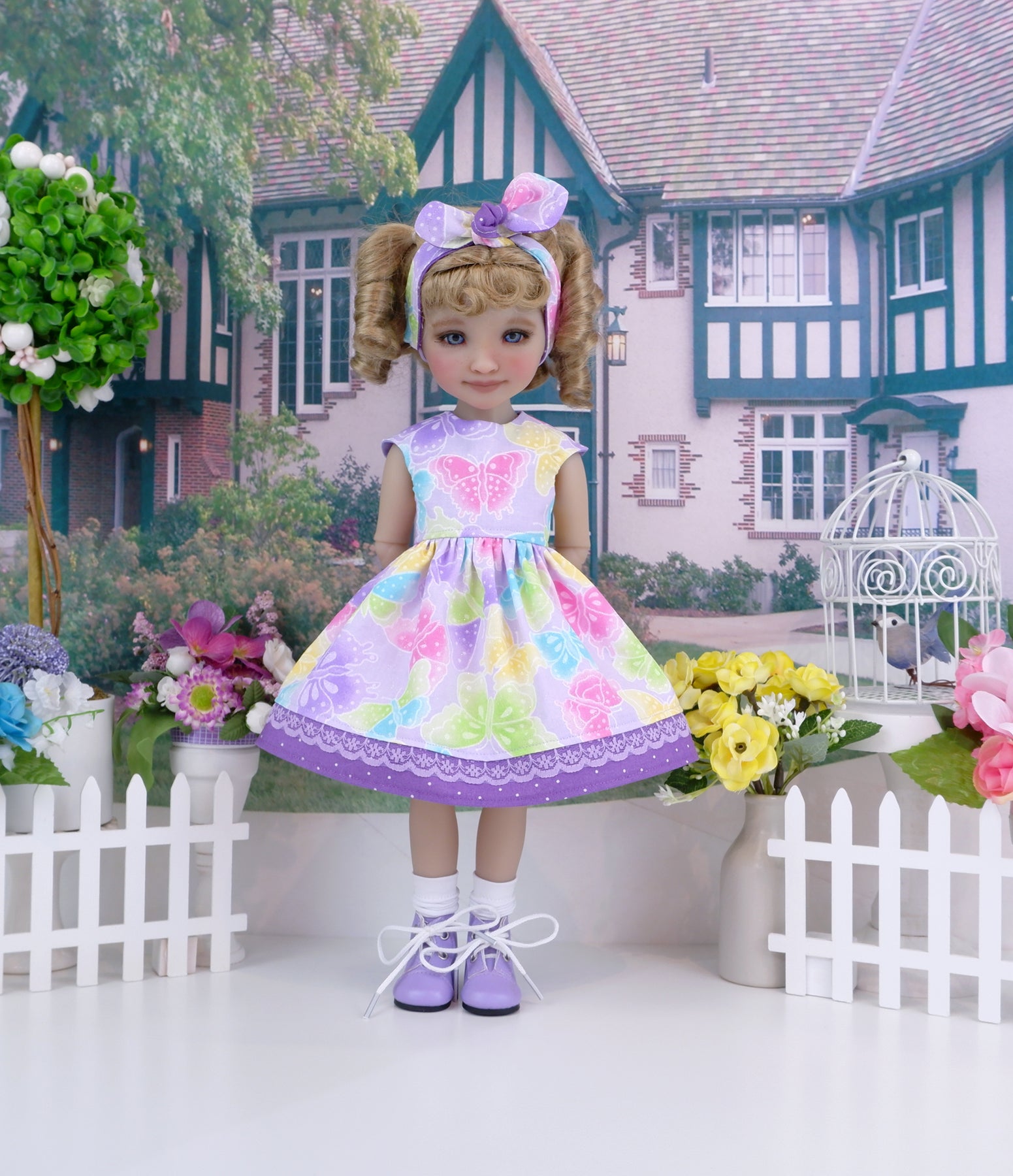 This darling dress ensemble is a great addition to any Ruby Red Fashion Friend's wardrobe. The dress is made of a lovely butterfly print in a rainbow of colors on lavender cotton with hints of glitter. The fully lined bodice features a cap sleeve. The skirt is full and gathered at the waist for a wonderful silhouette with lavender lace above the contrast purple polka dot print cotton at the hem. The dress fastens in back with buttons. Add the matching headband for a hair accessory. The retro style knot headband is made of butterfly & polka dot print cottons and features elastic behind the neck for easy styling.