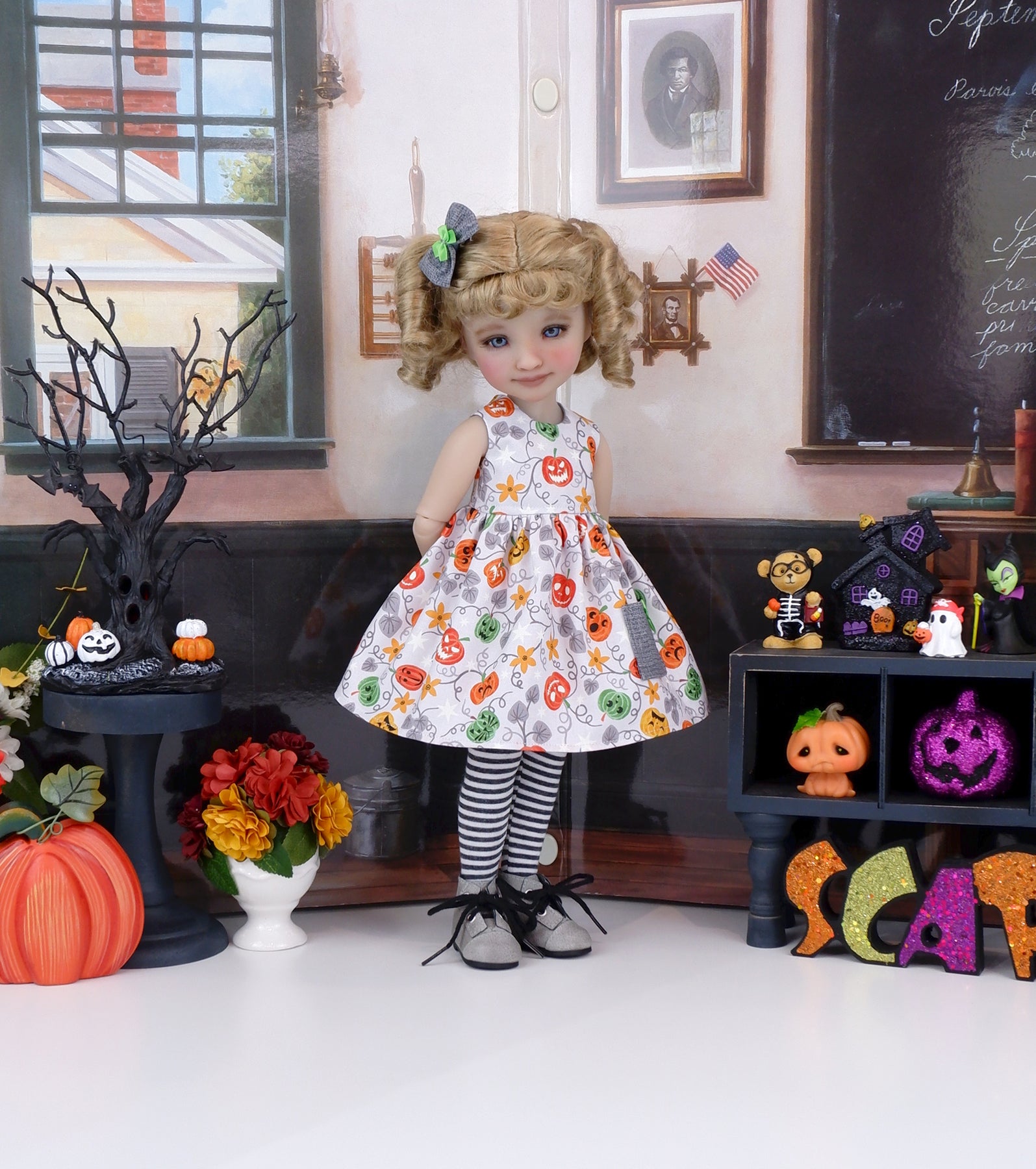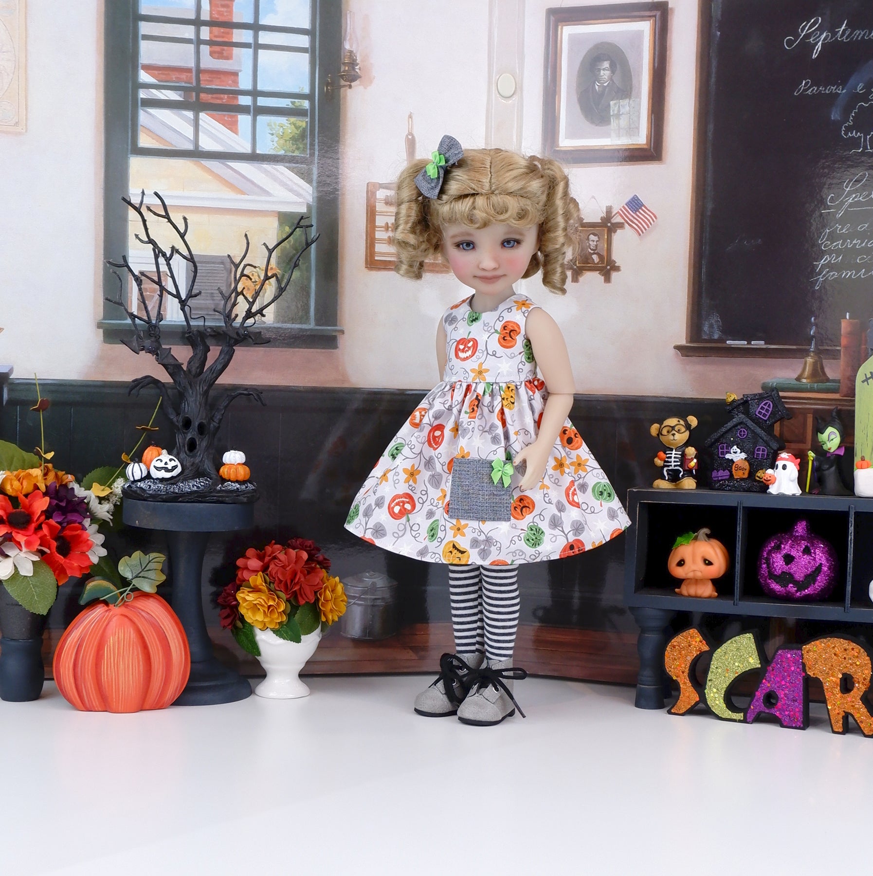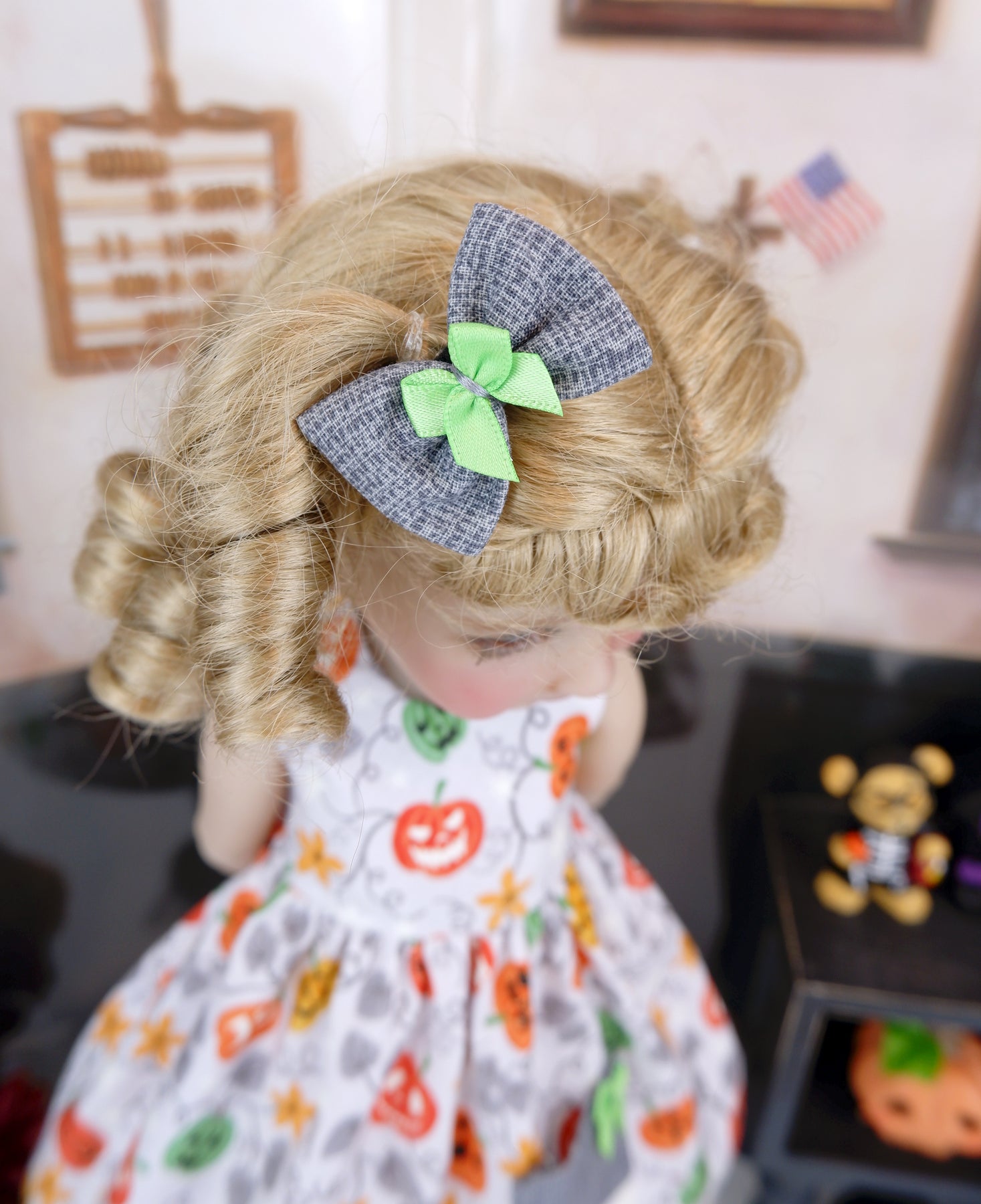 This charming babydoll dress ensemble is a great addition to any Ruby Red Fashion Friend's wardrobe for this Halloween. The dress is made of a delightful jack o'lantern pumpkin patch print in shades of orange, green and grey on dove grey cotton. The sleeveless bodice is fully lined with a babydoll waistline. The skirt is gathered at the waist for a pretty silhouette with a contrast grey crosshatch print cotton pocket adorned with a green ribbon bow. The dress fastens in back with a button covered snap. Add the matching hair clip for an easy hairstyle. A grey crosshatch print cotton fabric bow is adorned with a green ribbon bow.