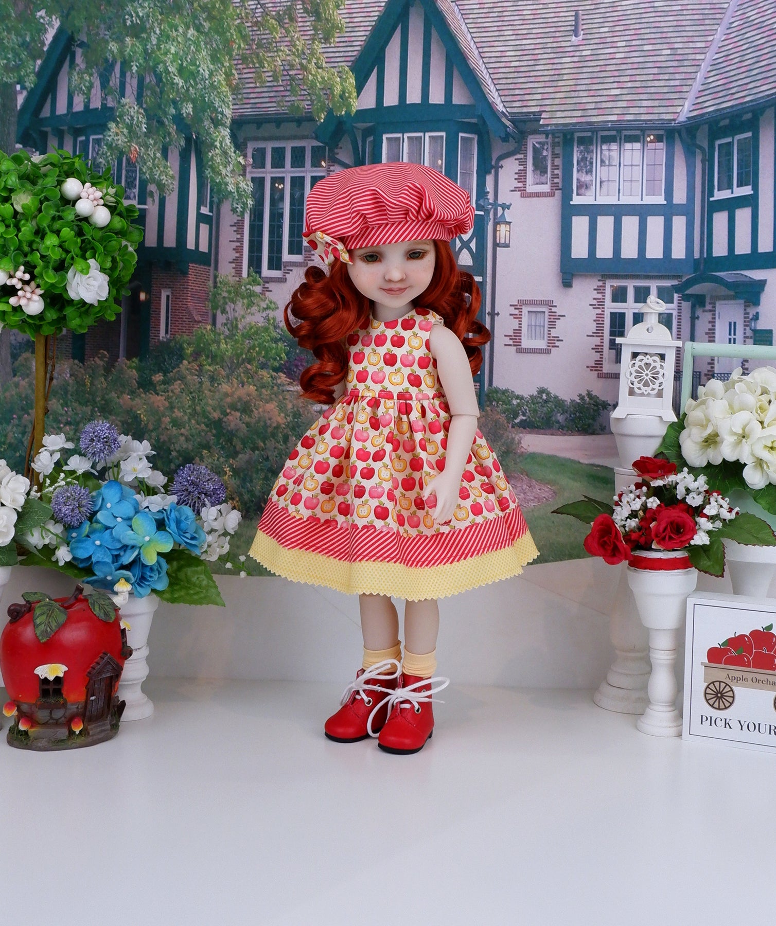 Her adorable sleeveless tiered dress is the perfect addition to Apple Dumpling's wardrobe. The dress is made of a yummy apple print in red, yellow, peach and coral on ivory cotton. The skirt is gathered at the babydoll waist for a lovely silhouette with pinked edge tiers in apple, red stripe and yellow polka dot print cottons. The dress fastens in back with buttons. Finish the look off with the matching hat. The fully lined beret is made of red and coral stripe print cotton with an apple fabric bow embellishing the hat brim. Red ankle lace up boots with yellow knee high socks are included to complete the ensemble.