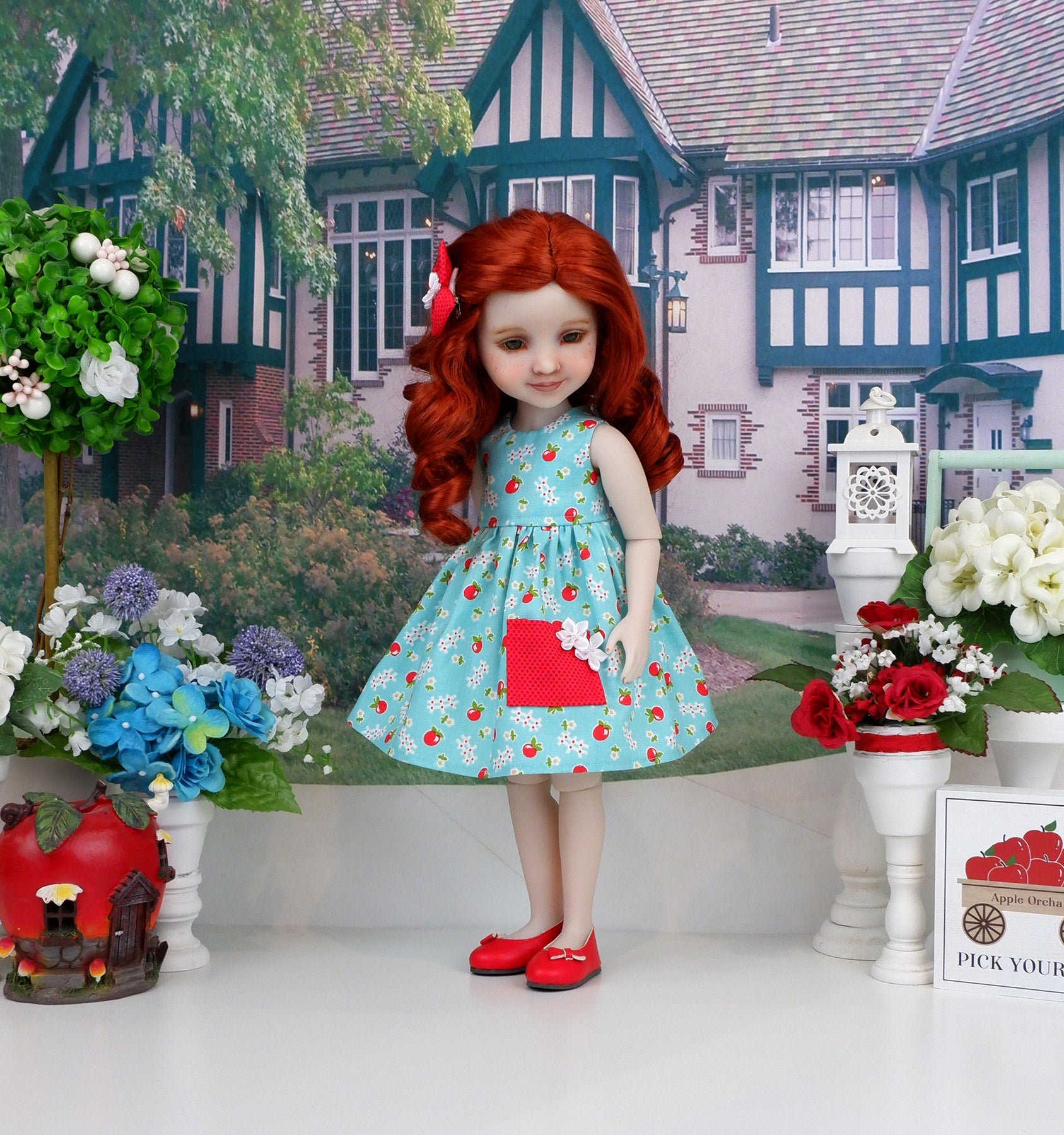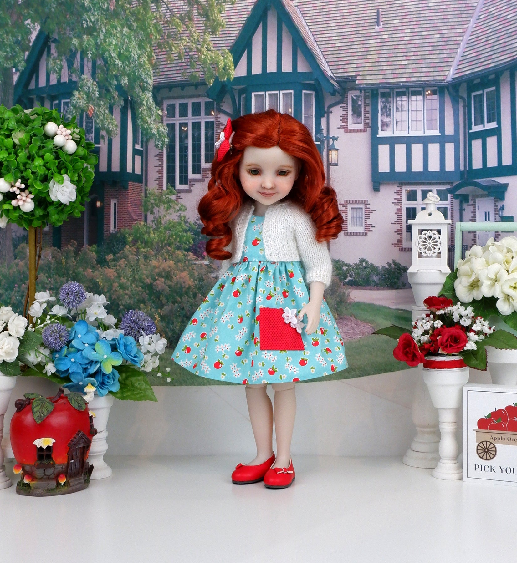 Finally she has a sleeveless sundress and sweater set. The dress is made of a darling red apple print with white picket fences on aqua cotton. The sleeveless bodice is fully lined with a babydoll waistline. The skirt is gathered at the waist for a pretty silhouette with a contrast red polka dot print cotton pocket adorned with two dainty white ribbon flowers. The dress fastens in back with a button covered snap. Add the matching hair clip for an easy hairstyle. A red dot print cotton fabric bow is embellished with a white ribbon flower. Pair with the coordinating sweater. The sweater is made of high quality fuzzy white yarn with 3/4 sleeves. Apple red bow toe ballet flats shoes are included to complete the ensemble.