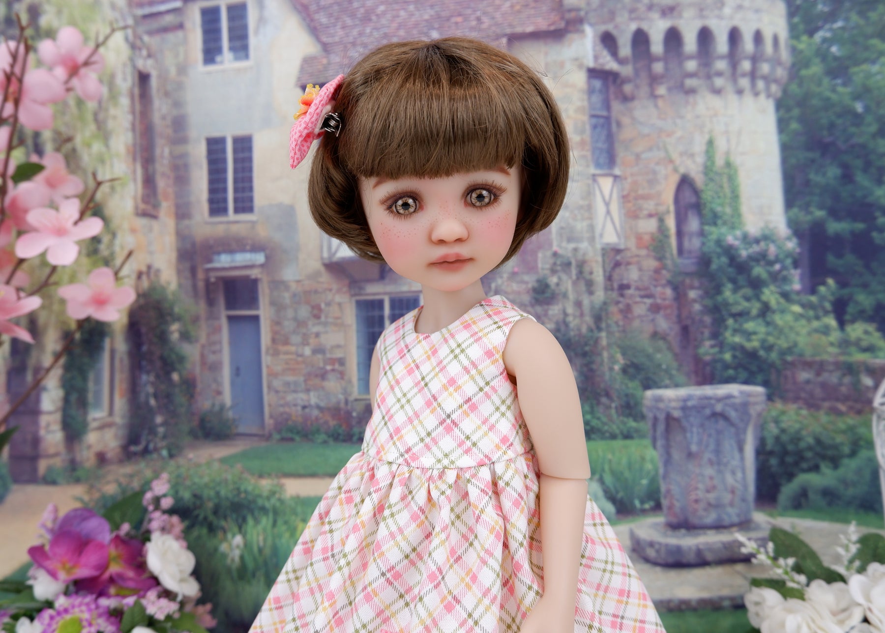 This sweet babydoll dress ensemble is a great addition to any Ruby Red Fashion Friend's wardrobe. The dress is made of a pretty plaid in sage, golden yellow and coral on ivory cotton. The sleeveless bodice is fully lined with a babydoll waistline. The skirt is gathered at the waist for a lovely silhouette with a contrast salmon polka dot print cotton pocket adorned with two variegated yellow ribbon flowers. The dress fastens in back with a button covered snap. Add the matching hair clip for an easy hairstyle. A salmon polka dot cotton fabric bow is adorned with a varigated yellow ribbon flower.