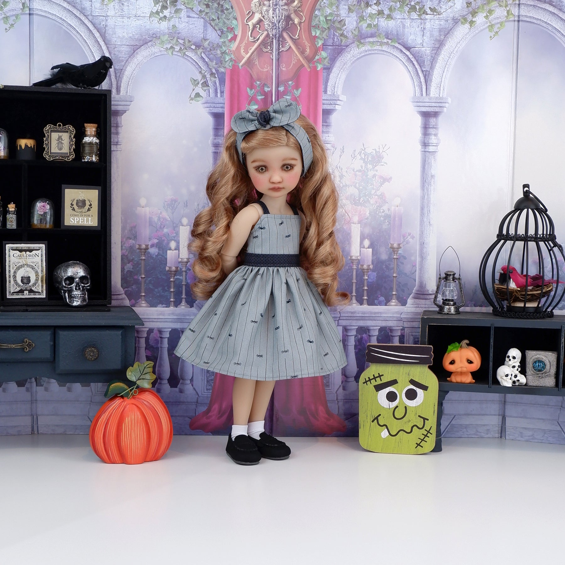 This adorable dress ensemble is a great addition to any Ruby Red Fashion Friend's wardrobe for celebrating this Halloween. The sundress is made of a cute tiny black spider striped print on grey cotton. The bodice has tiny contrast black polka dot print straps at the shoulders and is fully lined. The contrast waistband is also made of polka dot print cotton. The skirt is full and gathered at the waist for a wonderful silhouette. The dress fastens in back with buttons. Add the matching headband for a hair accessory. The retro style knot headband is made of spider & polka dot print cottons and features elastic behind the neck for easy styling.