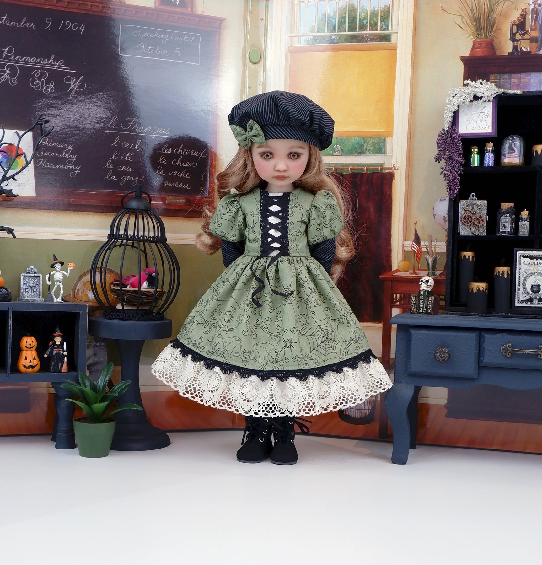 This stunning ensemble is the ideal addition to any Fashion Friend's wardrobe for celebrating All Hallow's Eve. The dress is made of a beautiful filigree spider web print in black on sage green cotton. The fully lined bodice has a contrast front panel in ivory leaf print cotton. The corset effect is achieved with overlays edged with black crochet lace, laced through with black ribbon and tied in a bow at the waist. The gigot sleeves are made of spider print with a straight lower sleeve of black striped cotton. The skirt is full and gathered at the waist for the perfect silhouette with black crochet lace over the delicate ivory lace peeking out beneath the hem. The dress fastens in back with buttons. Finish the look off with the matching hat. The fully lined beret is made of black stripe print cotton with a filigree spiderweb print cotton bow embellishing the hat band.