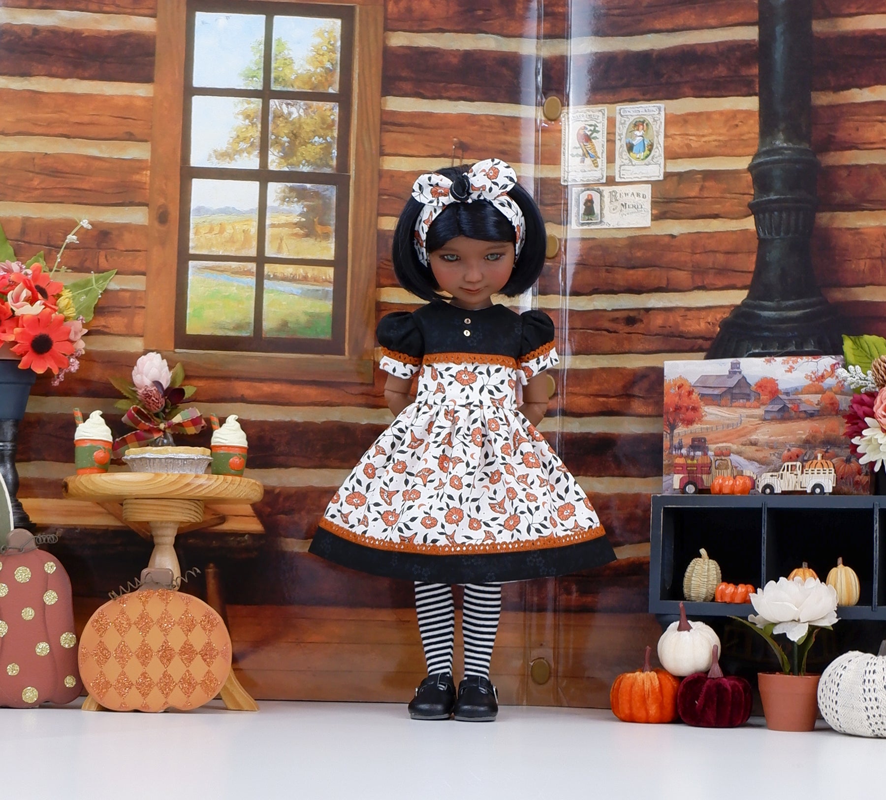 This pretty dress is a great addition to any Fashion Friend's wardrobe for this Fall. The dress is made of a beautiful morning glory floral print in pumpkin and black on white cotton. The bodice is fully lined and features a contrast overlay of black floral print cotton trimmed with pumpkin crochet lace across the chest. Two dainty gold buttons adorn the bodice. The short sleeves are also made of black floral cotton gathered to a contrast band of morning glory print accented with pumpkin crochet lace above the elbow. The skirt is full and gathered at the waist for a wonderful silhouette with pumpkin crochet lace above the contrast black floral print cotton band at the hem. The dress fastens in back with buttons. Add the matching headband for a hair accessory. The retro style knot headband is made of floral print cottons and features elastic behind the neck for easy styling.