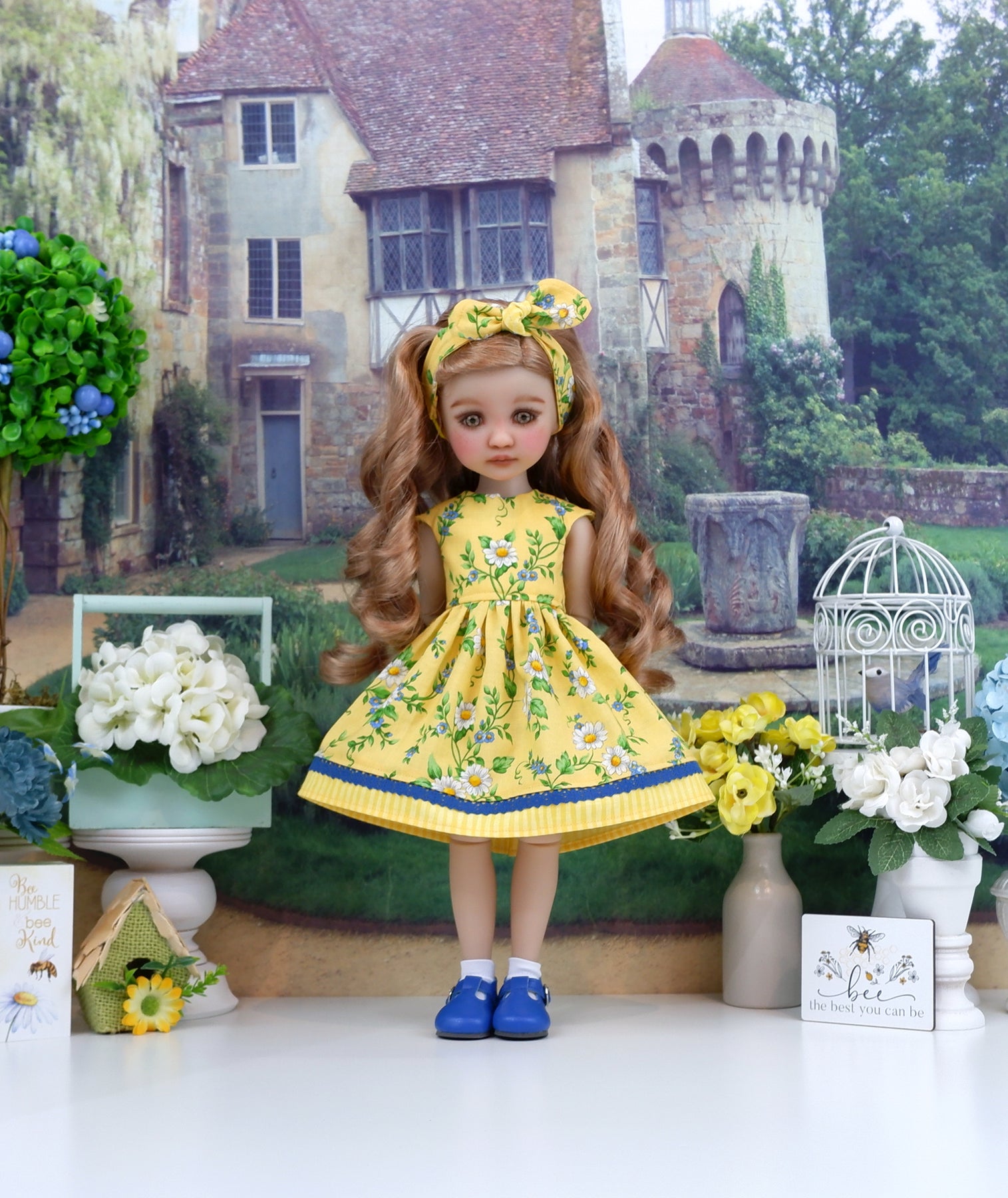 This lovely dress ensemble is a great addition to any Ruby Red Fashion Friend's wardrobe. The dress is made of a beautiful daisy print with blue floral on yellow cotton. The fully lined bodice features a cap sleeve. The skirt is full and gathered at the waist for a wonderful silhouette with blue crochet lace above the contrast yellow stripe print cotton at the hem. The dress fastens in back with buttons. Add the matching headband for a hair accessory. The retro style knot headband is made of flower & stripe print cottons and features elastic behind the neck for easy styling.