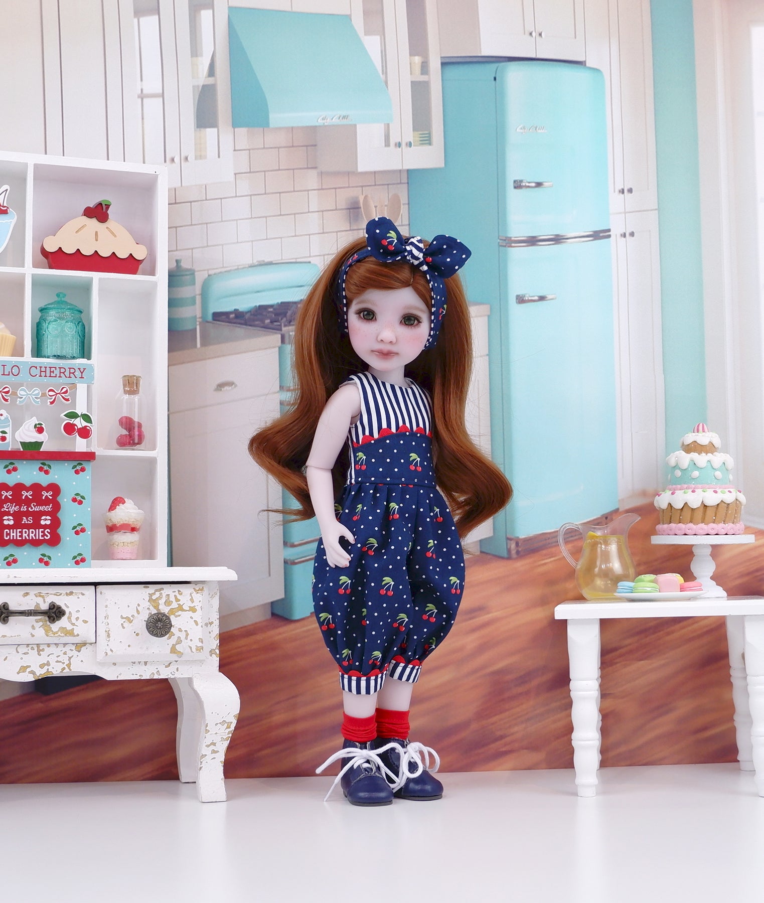 This sweet romper set is the perfect addition to your Fashion Friend's wardrobe. The romper is made of a beautiful red cherry print on navy blue cotton. The fully lined sleeveless bodice is made of contrast navy stripe cotton with an overlay of cherry print trimmed with red rick rack. The pants are gathered at the waist and feature red rick rack at the contrast stripe leg cuffs. The romper fastens in back with buttons. Add the matching headband for a hair accessory. The retro style knot headband is made of cherry & stripe print cottons and features elastic behind the neck for easy styling.