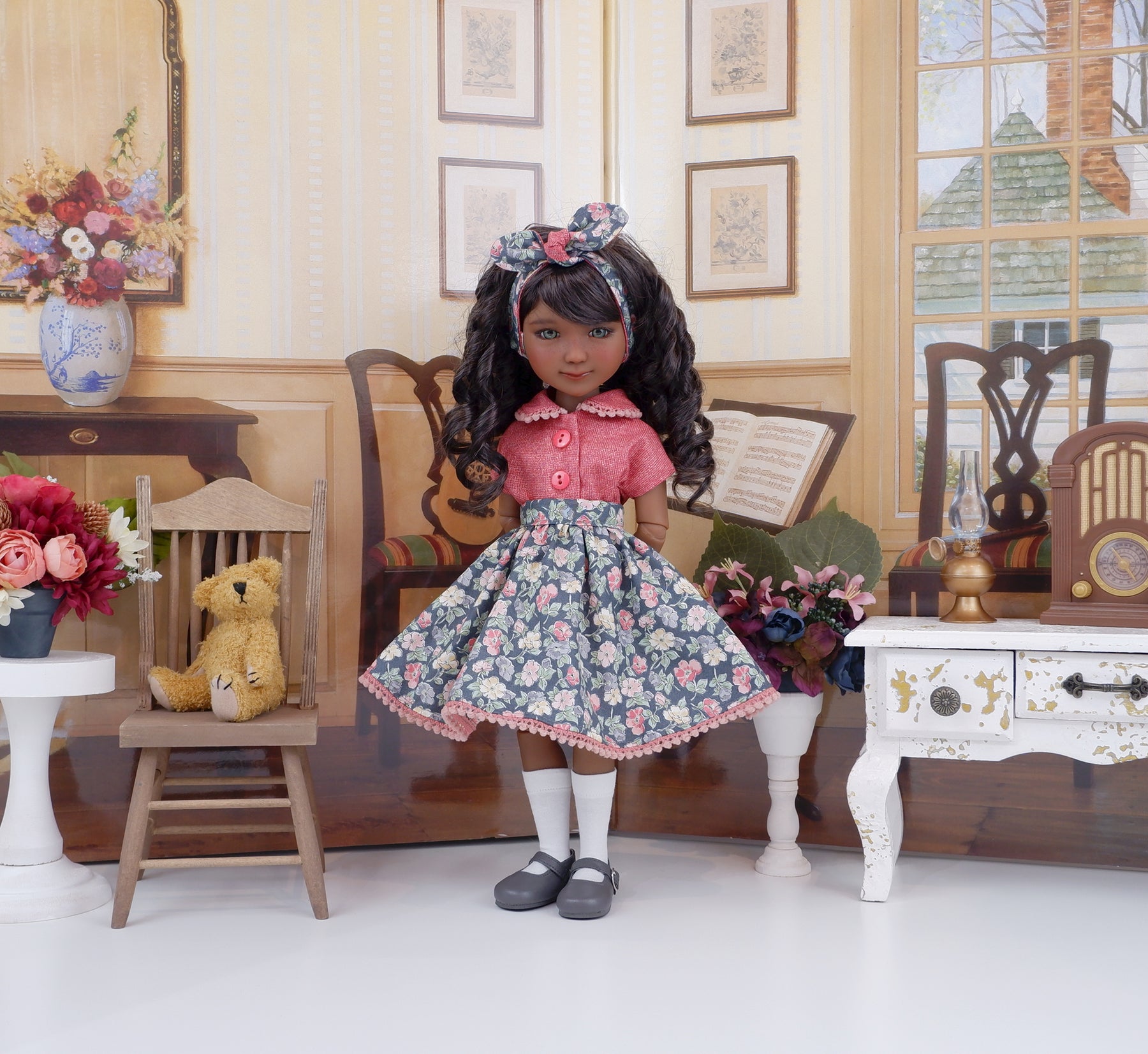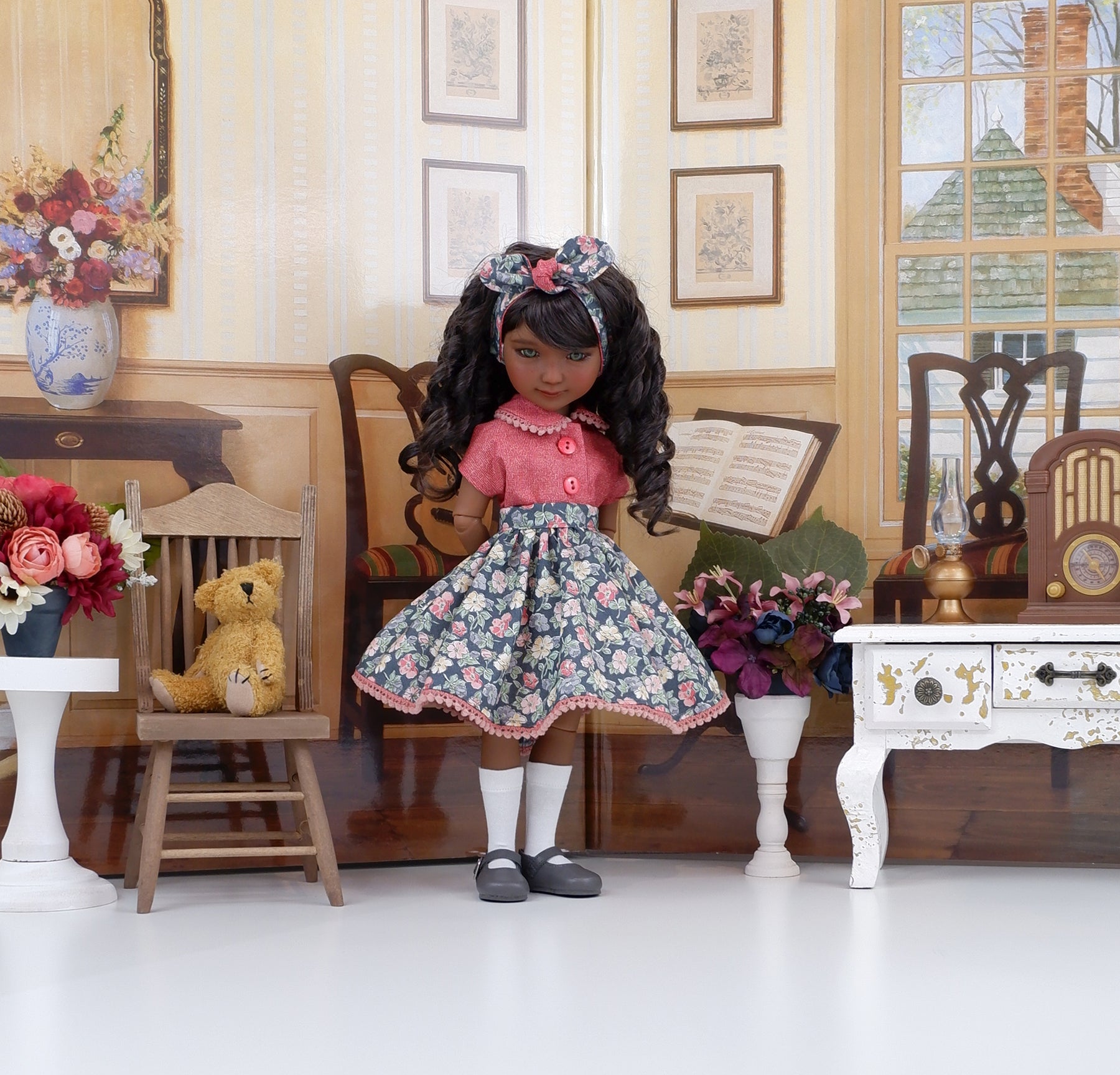 In true retro style this ensemble is a great addition to any Ruby Red Fashion Friend's wardrobe. The blouse is made of lovely persimmon square print cotton. The blouse features a peter pan collar adorned with blush pom pom trim and cap sleeves. The blouse fastens down the front with buttons. The circle skirt creates a pretty silhouette. The skirt is made of a beautiful floral print in peach, ivory and persimmon on grey cotton. The skirt is cut on the bias with blush pom pom trim peeking out beneath the hem. The skirt fastens with a button covered snap at the waist band. Add the matching headband for a hair accessory. The retro style knot headband is made of floral & square print cottons and features elastic behind the neck for easy styling.