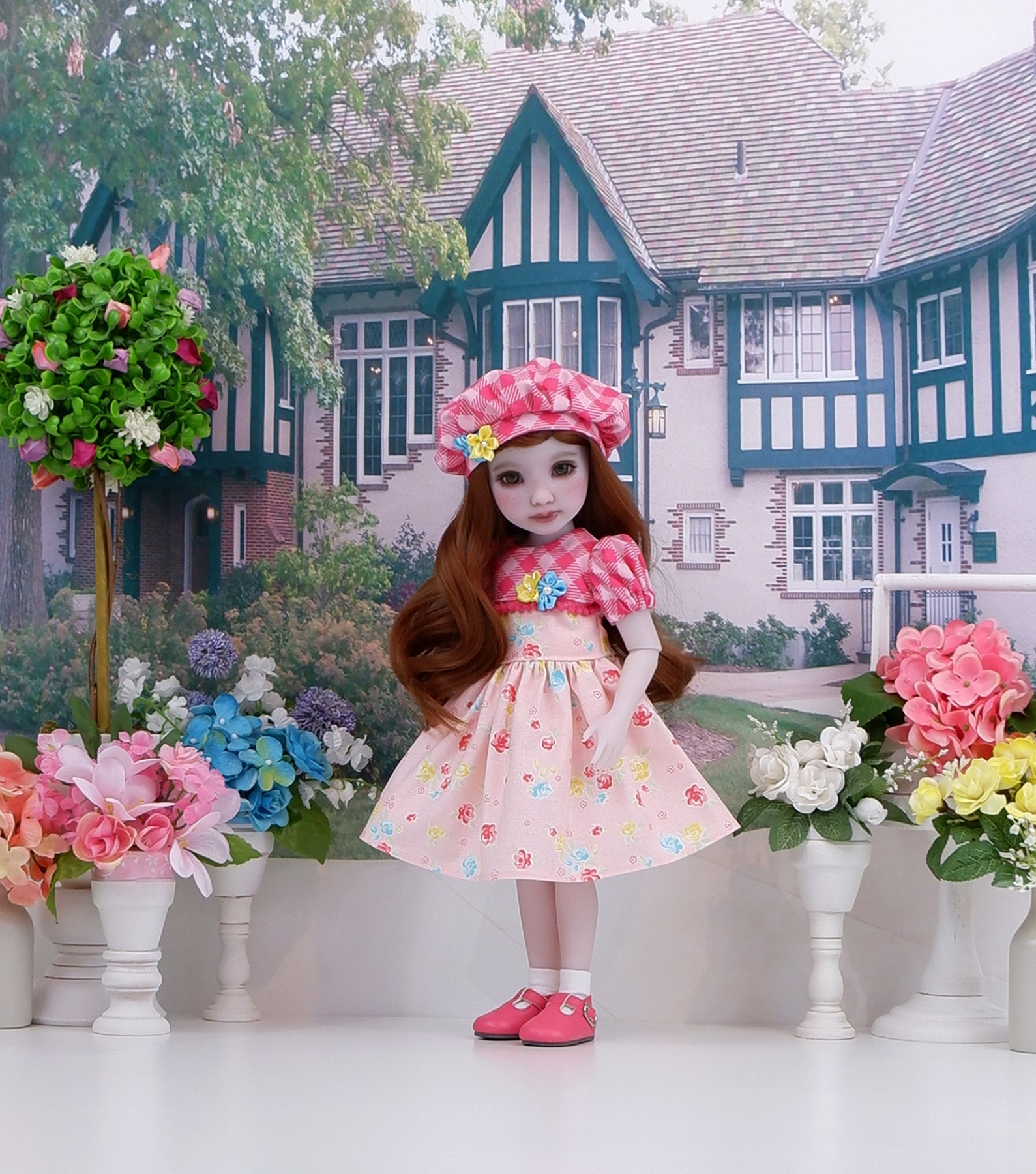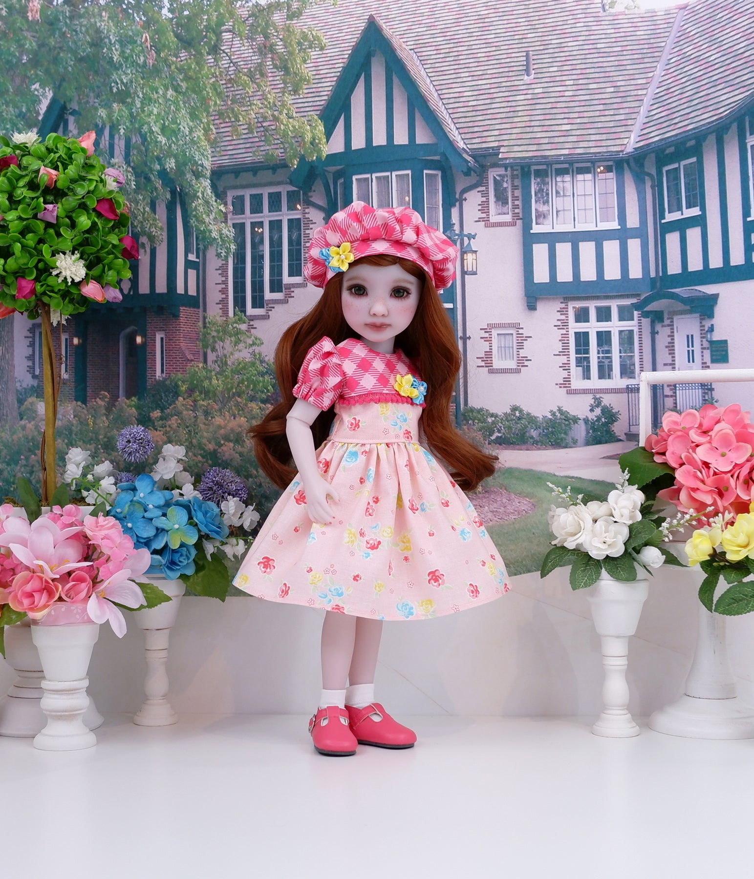 This sweet dress is the perfect addition to any Fashion Friend's wardrobe. The dress is made of a beautiful floral print with coral, turquoise and yellow roses on pink blush cotton. The bodice is fully lined and features a contrast overlay of coral and blush pink gingham print cotton in front embellished with coral pom pom trim across the chest. Two ribbon flowers in turquoise and yellow adorn the bodice. The short gathered sleeves are also made of gingham cotton and have a bit of elastic above the elbow. The skirt is full and gathered at the waist for a wonderful silhouette. The dress fastens in back with buttons. Finish the look off with the matching hat. The fully lined beret is made of coral and blush pink gingham print cotton with two ribbon flowers in turquoise and yellow embellishing the hat brim.