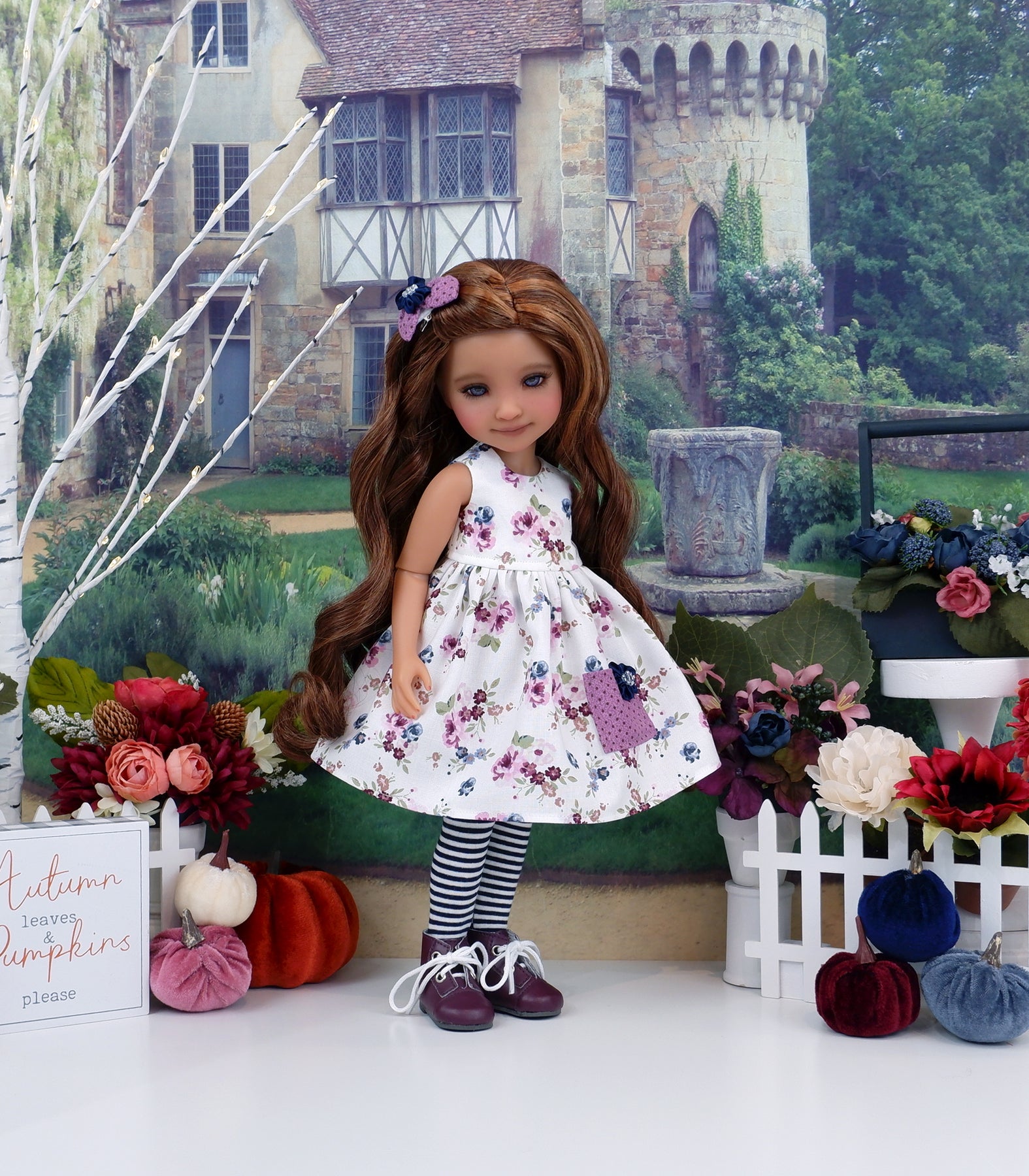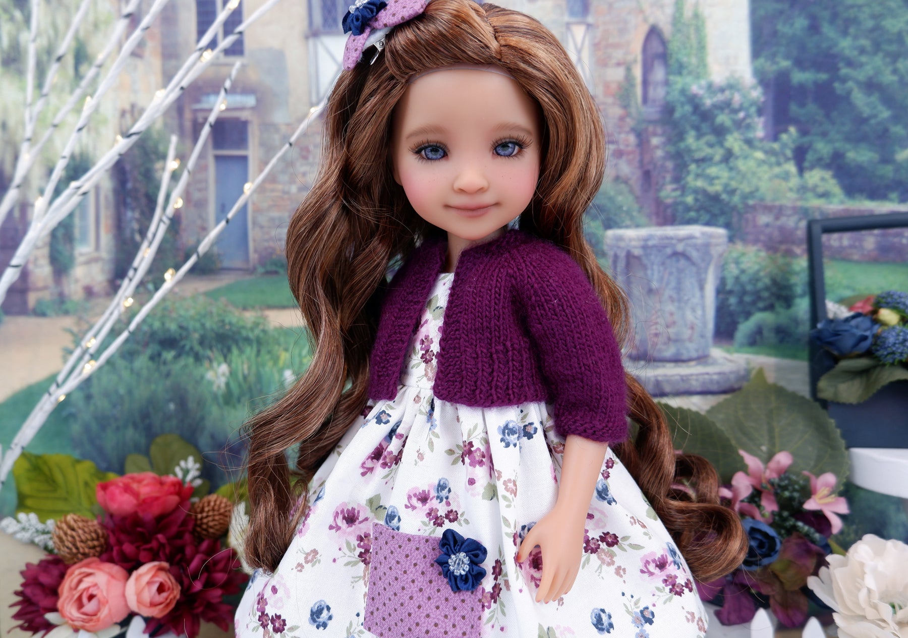 This beautiful babydoll dress and sweater ensemble is a great addition to any Ruby Red Fashion Friend's wardrobe. The dress is made of a stunning rose print in burgundy, rose, blue and navy on white cotton. The sleeveless bodice is fully lined with a babydoll waistline. The skirt is gathered at the waist for a pretty silhouette with a contrast dusty plum polka dot print cotton pocket adorned with a navy blue ribbon flower. The dress fastens in back with a button covered snap. Add the matching hair clip for an easy hairstyle. A polka dot cotton fabric bow is adorned with a navy blue ribbon flower. Wear alone or pair with the simple sweater. The sweater is made of high quality raisin yarn with 3/4 sleeves.