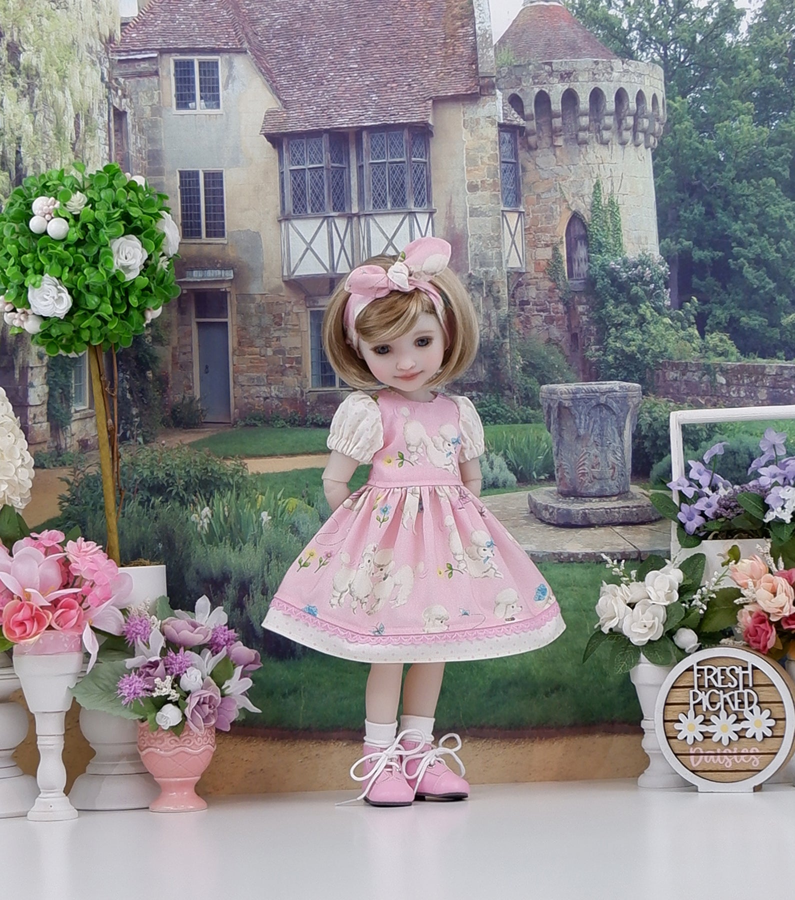 This darling dress is a great addition to any Fashion Friend's wardrobe. The dress is made of a precious retro style poodle print on pink cotton. The bodice is fully lined with short sleeves. The sleeves are made of contrast pink polka dot print on ivory cotton gathered with a bit of elastic above the elbow. The skirt is full and gathered at the waist for a wonderful silhouette with an inset of pink crochet lace above the contrast polka dot print cotton band at the hem. The dress fastens in back with buttons. Add the matching headband for a hair accessory. The retro style knot headband is made of puppy & polka dot print cottons and features elastic behind the neck for easy styling.