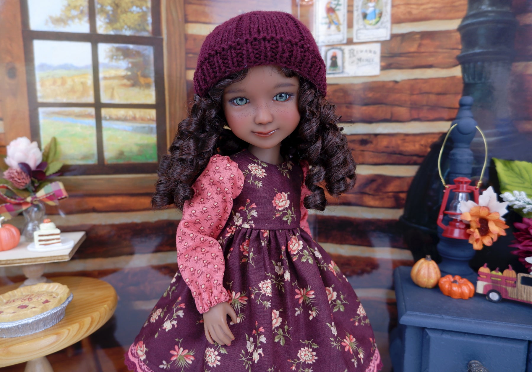 This gorgeous ensemble will be the perfect addition to your Fashion Friend's closet for this Autumn. The dress is made of a beautiful floral print in peach and persimmon on burgundy cotton. The bodice is fully lined with contrast persimmon floral print cotton full length long sleeves featuring a bit of elastic at the wrist. The skirt is gathered at the waist for a wonderful silhouette with coral lace over burgundy crochet lace peeking out beneath the hem. The dress fastens in back with buttons. To add to the charm of her outfit, she has a knit hat. Her knitwear is made of high quality burgundy yarn.