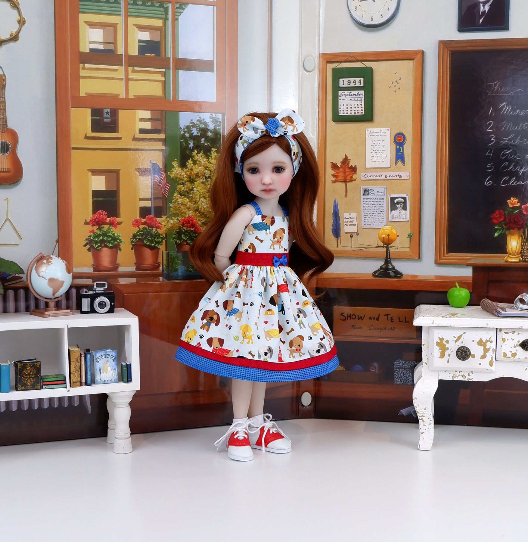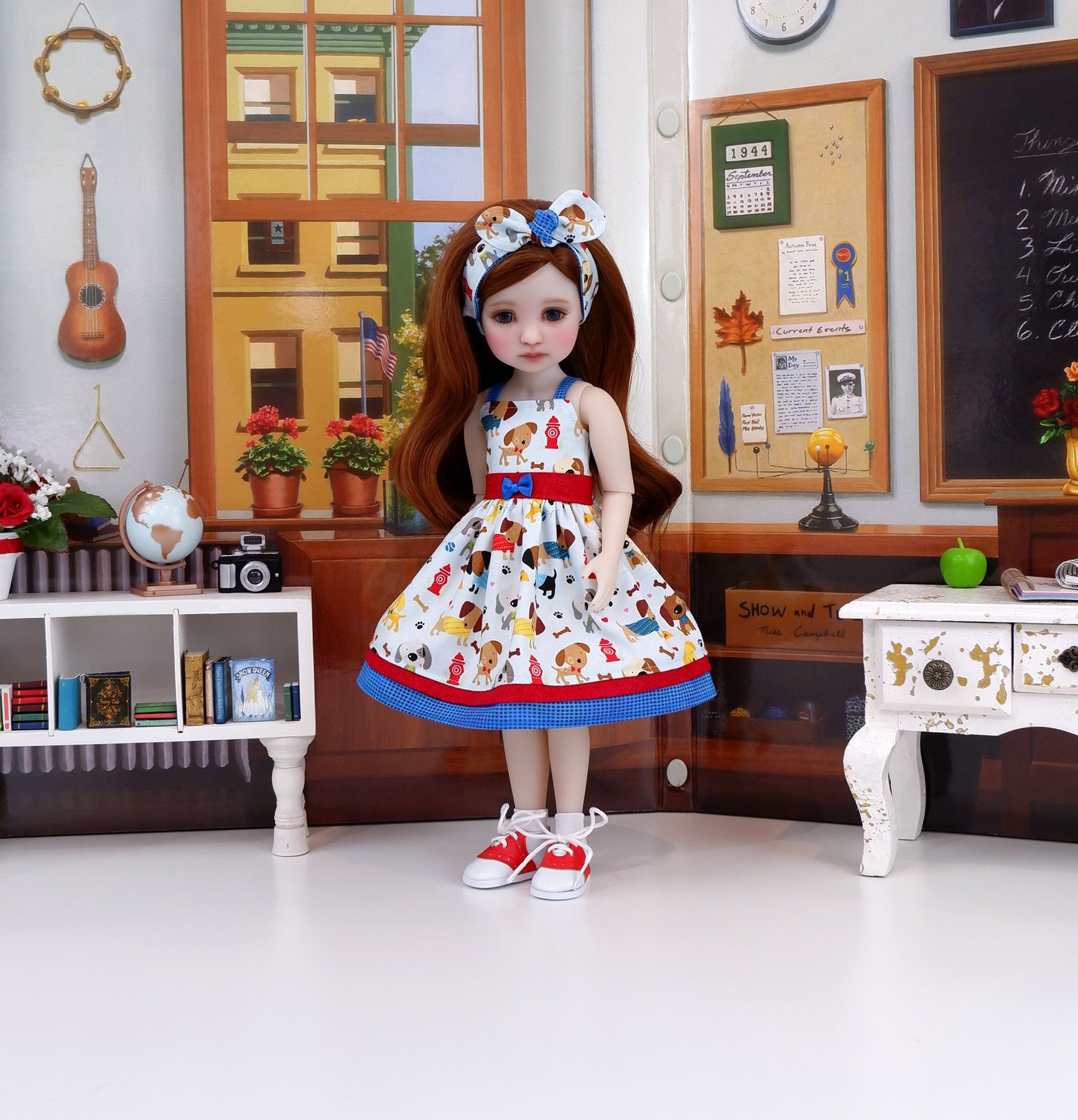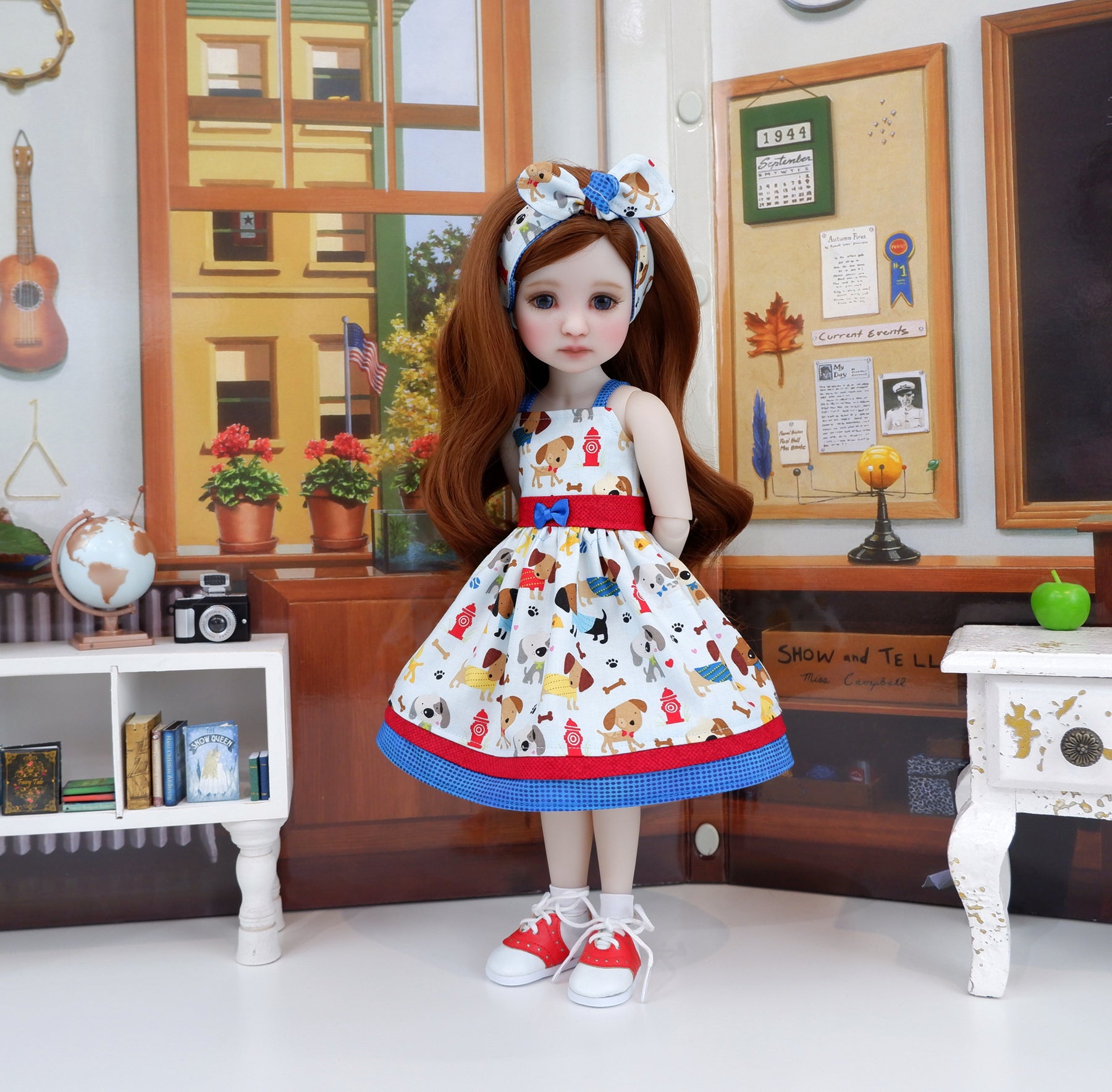 This cute sundress ensemble is a great addition to any Ruby Red Fashion Friend's wardrobe. The dress is made of an adorable dog print with balls, bones and fire hydrants on pale blue cotton. The bodice has tiny contrast blue dot print straps at the shoulders and is fully lined. The contrast waistband is made of red square print cotton. A dainty blue ribbon bow adorns the waist. The skirt is full and gathered at the waist for a wonderful silhouette with an inset of red square print above the contrast blue dot print cotton. The dress fastens in back with buttons. Add the matching headband for a hair accessory. The retro style knot headband is made of puppy & dot print cottons and features elastic behind the neck for easy styling.