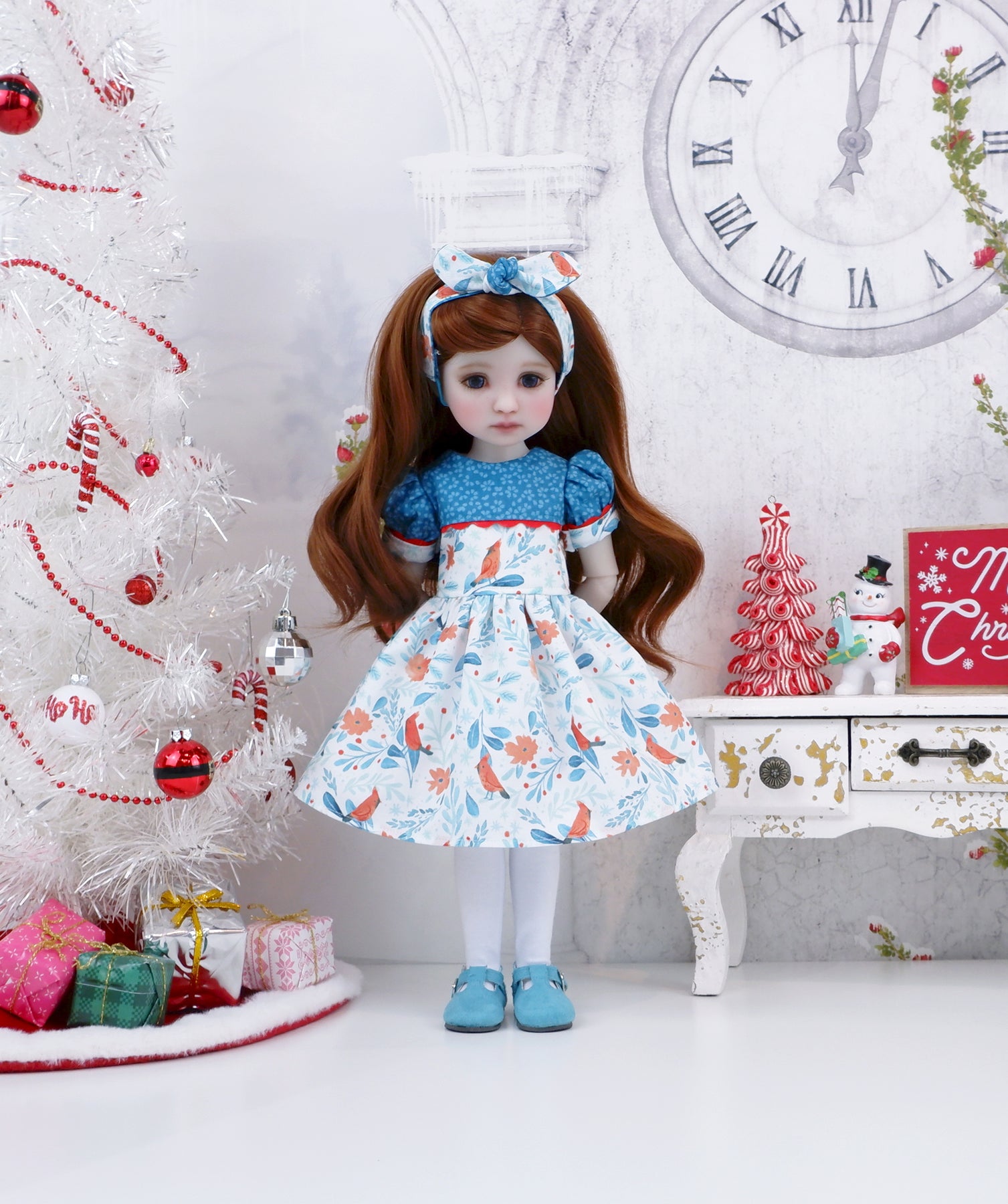 This beautiful dress is a great addition to any Fashion Friend's wardrobe for this Winter. The dress is made of a lovely watercolor cardinal print with poinsettias and holly sprigs in persimmon, aqua and mallard blue on white cotton. The bodice is fully lined and features a contrast overlay of mallard blue floral print cotton trimmed with red rick rack across the chest. The short sleeves are also made of floral cotton gathered to a contrast band of cardinal print accented with red rick rack above the elbow. The skirt is full and gathered at the waist for a wonderful silhouette. The dress fastens in back with buttons. Add the matching headband for a hair accessory. The retro style knot headband is made of cardinal & flower print cottons and features elastic behind the neck for easy styling.