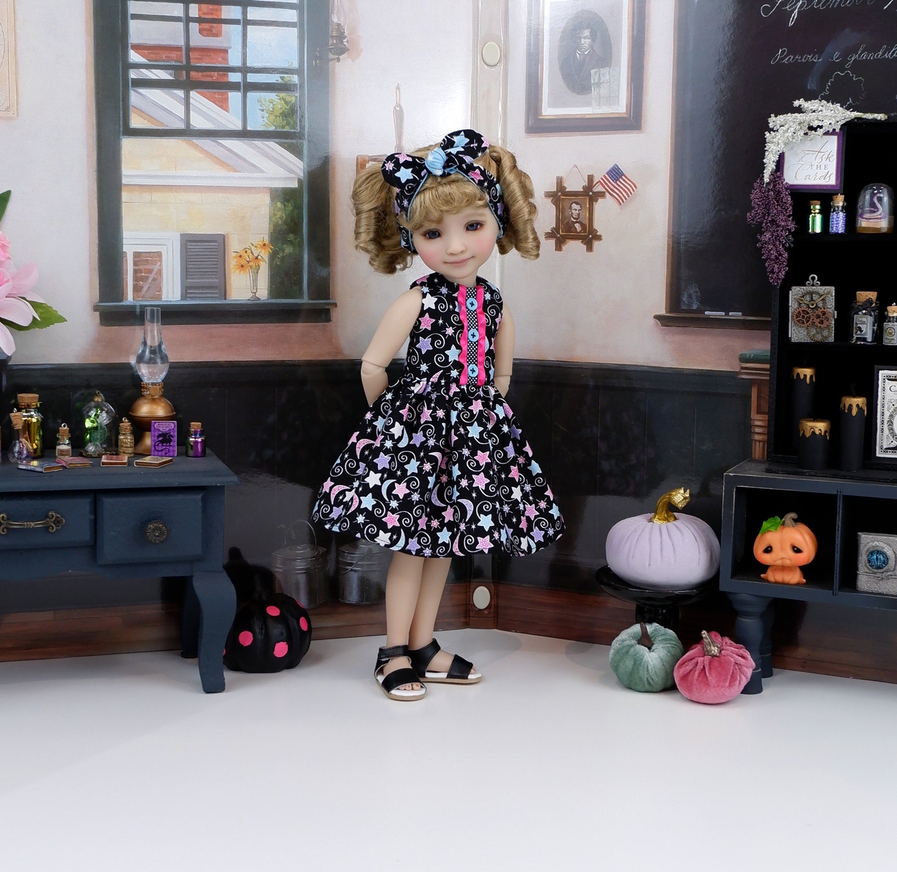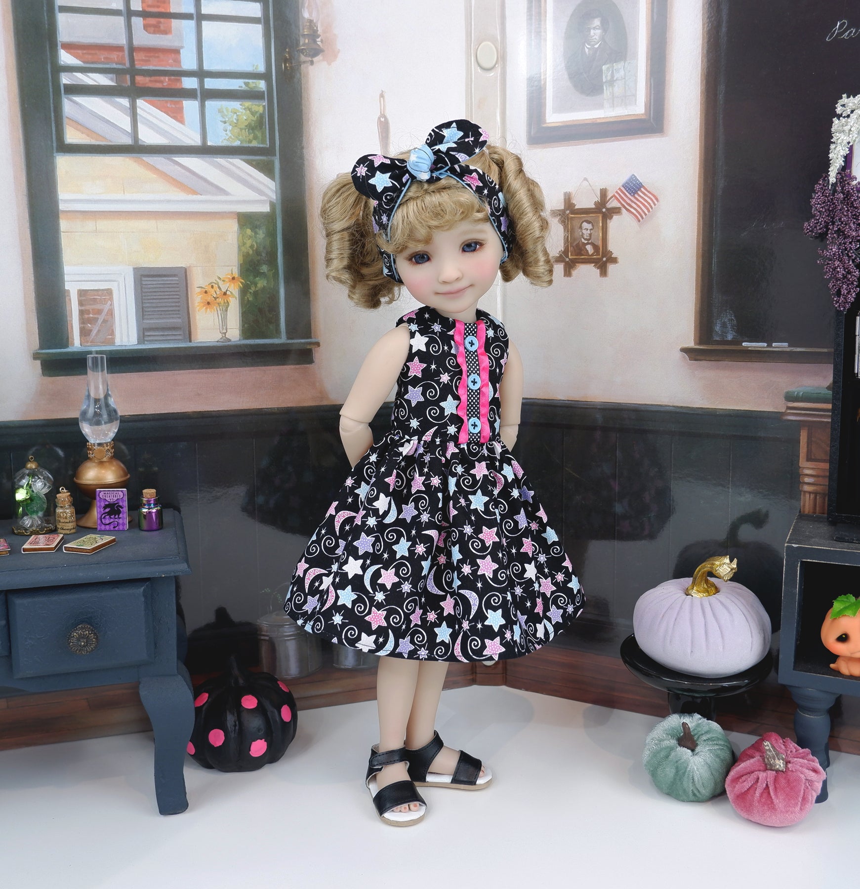This adorable dress is the perfect addition to your Fashion Friend's wardrobe. The dress is made of a cute moon and star print in pink, sky blue and lavender on black swirl print cotton. The sleeveless bodice is fully lined with a faux placket down the front with hot pink ruffle ribbon beneath black polka dot ribbon. Three tiny turquoise buttons adorn the bodice. The skirt is gathered at the waist for a lovely silhouette. The dress fastens in back with buttons. Add the matching headband for a hair accessory. The retro style knot headband is made of magic moon & sky blue star print cottons and features elastic behind the neck for easy styling.
