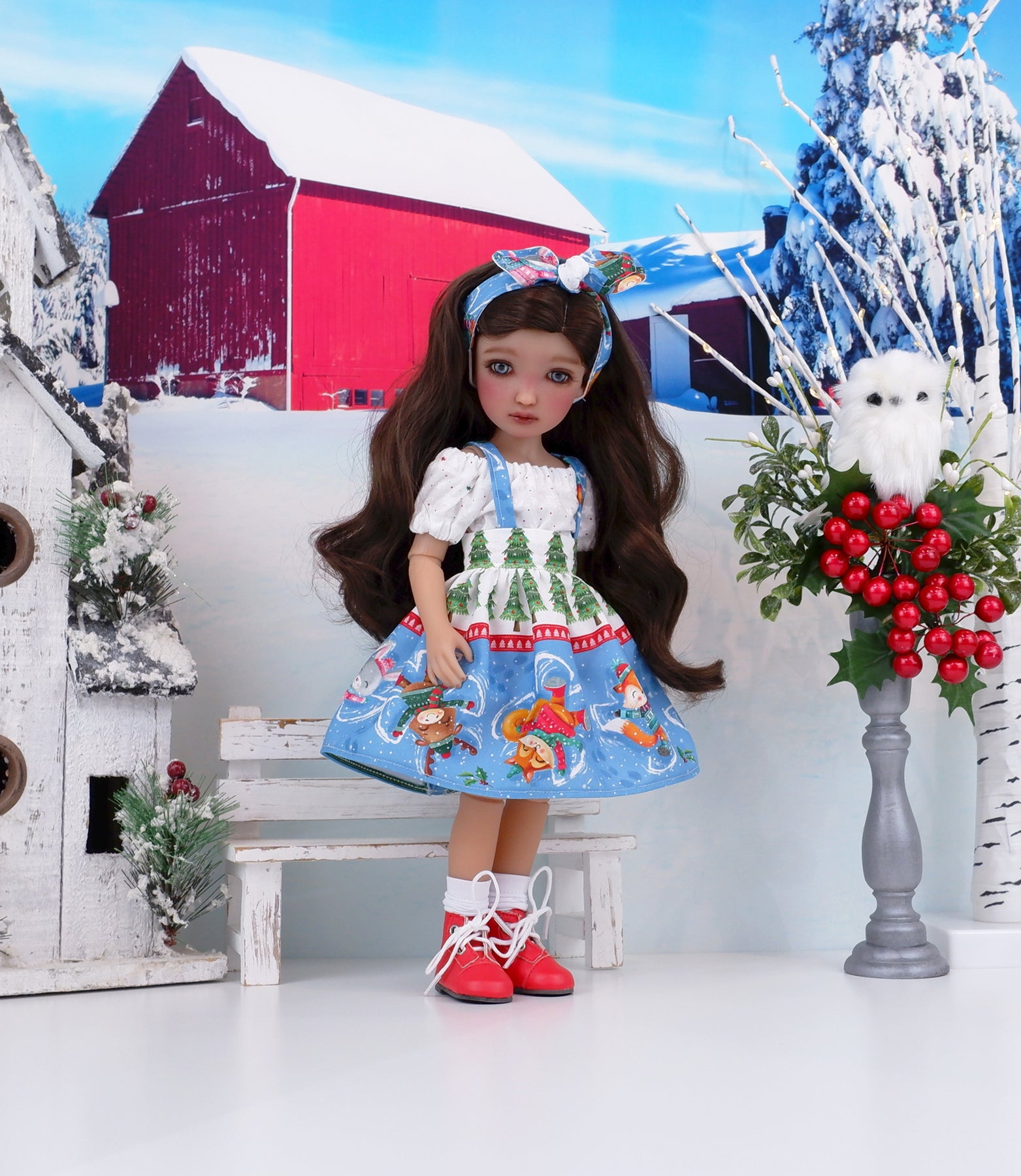 This adorable ensemble will be a perfect addition to your Ruby Red Fashion Friend's wardrobe for celebrating this Christmas. The peasant blouse is made of pretty red and green star print on white cotton. The blouse features elastic at the neckline for an over or across shoulder look. The short sleeves have elastic above the elbow. The shirt looks great bloused into the suspender jumper skirt. The jumper is made of a charming forest critter border print cotton with reindeer, fox and bunnies making snow angels. The skirt features straps that attach at the waist. The skirt fastens with a button covered snap at the waist band. Add the matching headband for a hair accessory. The retro style knot headband is made of critter & star print cottons and features elastic behind the neck for easy styling.