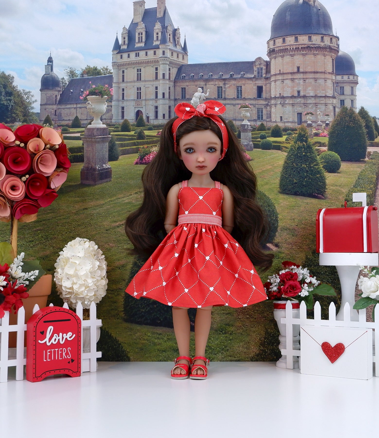 This charming sundress ensemble is a great addition to any Ruby Red Fashion Friend's wardrobe for celebrating Valentine's Day. The dress is made of a lovely ivory heart lattice print on red cotton. The bodice has tiny contrast red crosshatch print straps at the shoulders and is fully lined. The contrast waistband is also made of crosshatch print cotton. The skirt is full and gathered at the waist for a wonderful silhouette. The dress fastens in back with buttons. Add the matching headband for a hair accessory. The retro style knot headband is made of heart & crosshatch print cottons and features elastic behind the neck for easy styling.