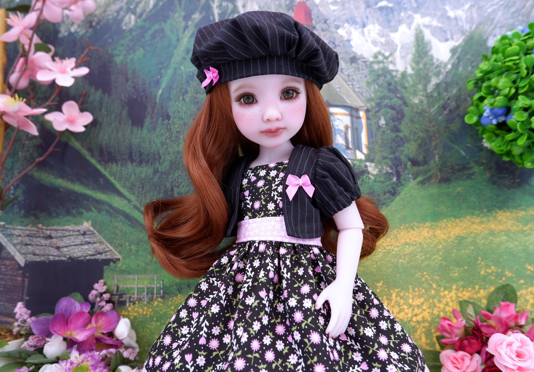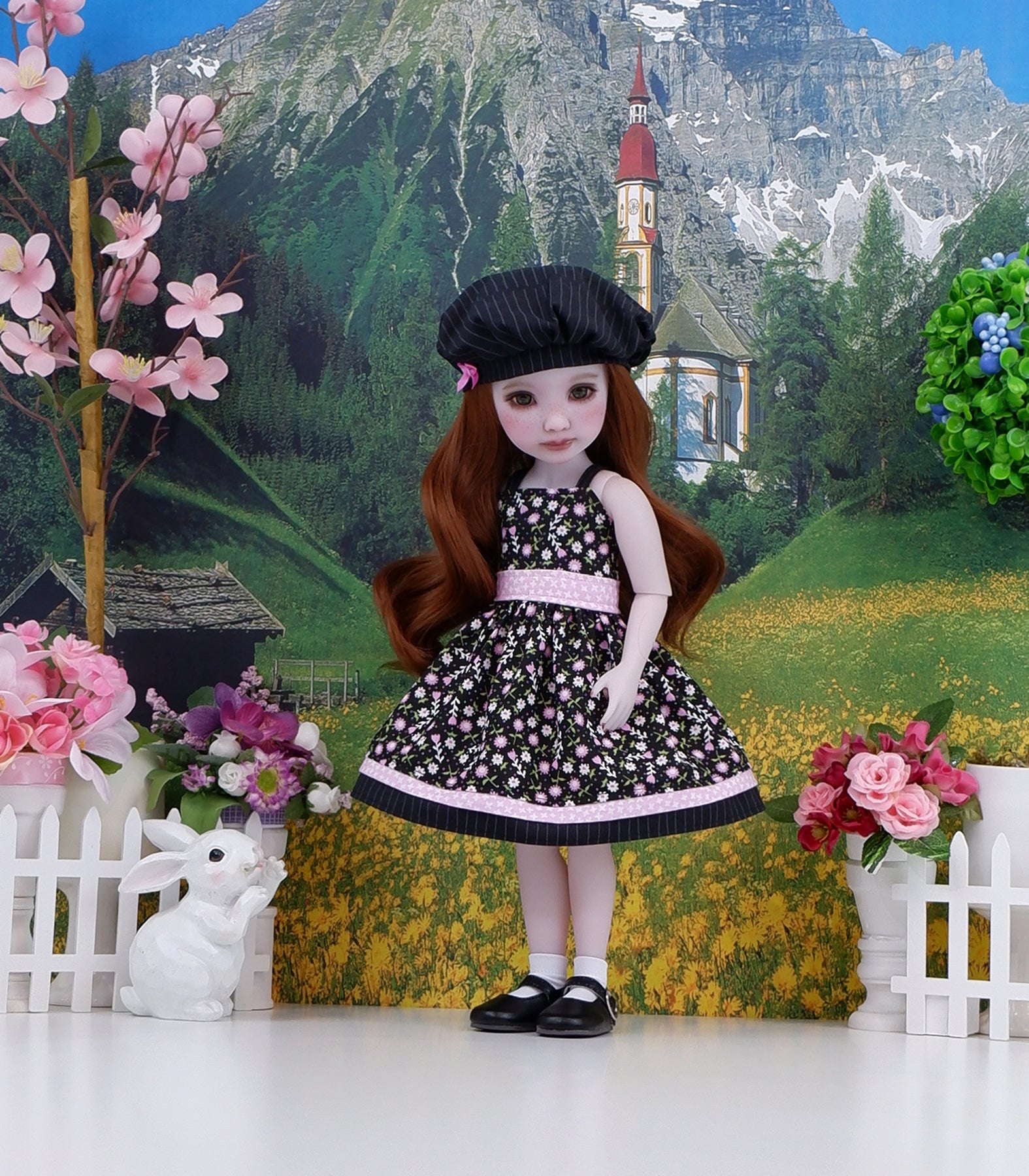 This darling sundress ensemble is a great addition to any Ruby Red Fashion Friend's wardrobe. The dress is made of a precious pink and white wildflower print tossed on black cotton. The bodice has tiny contrast black stripe print straps at the shoulders and is fully lined. The contrast waistband is made of orchid pink "x" print cotton. The skirt is full and gathered at the waist for a wonderful silhouette with an inset of orchid pink "x" cotton above the contrast black stripe print cotton band at the hem. The dress fastens in back with buttons. Pair with the matching jacket. The fully lined jacket is made of black stripe cotton. The short sleeves feature a bit of elastic above the elbow. An orchid pink ribbon bow adorns one lapel. Complete this sweet outfit with the matching beret. The beret is fully lined and made of black stripe print cotton with an orchid pink ribbon bow anchored on the hat band.