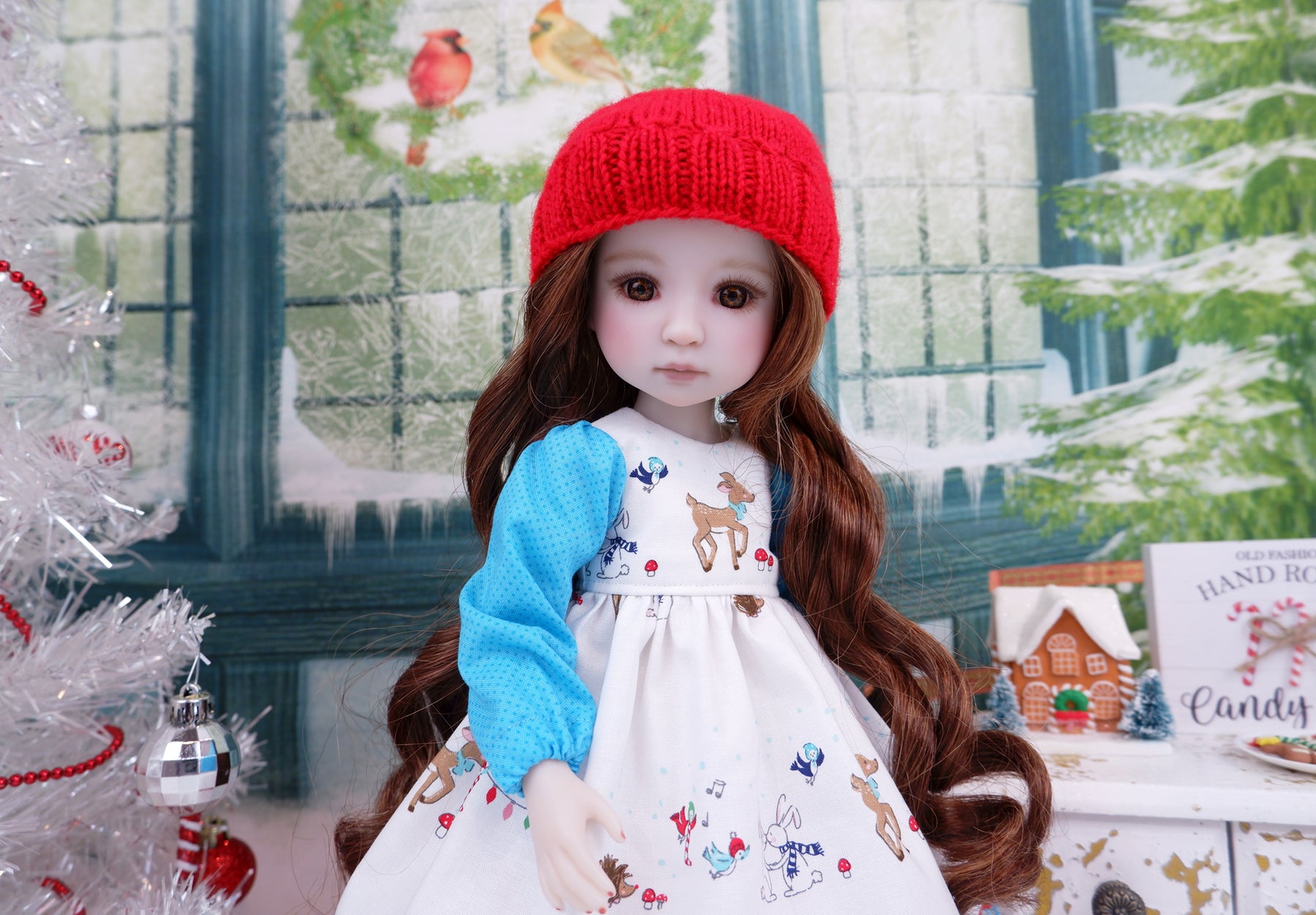 This precious ensemble will be the perfect addition to your Fashion Friend's closet for this Winter season. The dress is made of an adorable winter woodland critter print with deer, birds, bunnies and hedgehogs on white cotton. The bodice is fully lined with contrast turquoise polka dot print cotton full length long sleeves featuring a bit of elastic at the wrist. The skirt is gathered at the waist for a wonderful silhouette with red rick rack over turquoise lace peeking out beneath the hem. The dress fastens in back with buttons. To add to the charm of her outfit, she has a knit hat. Her knitwear is made of high quality red yarn.