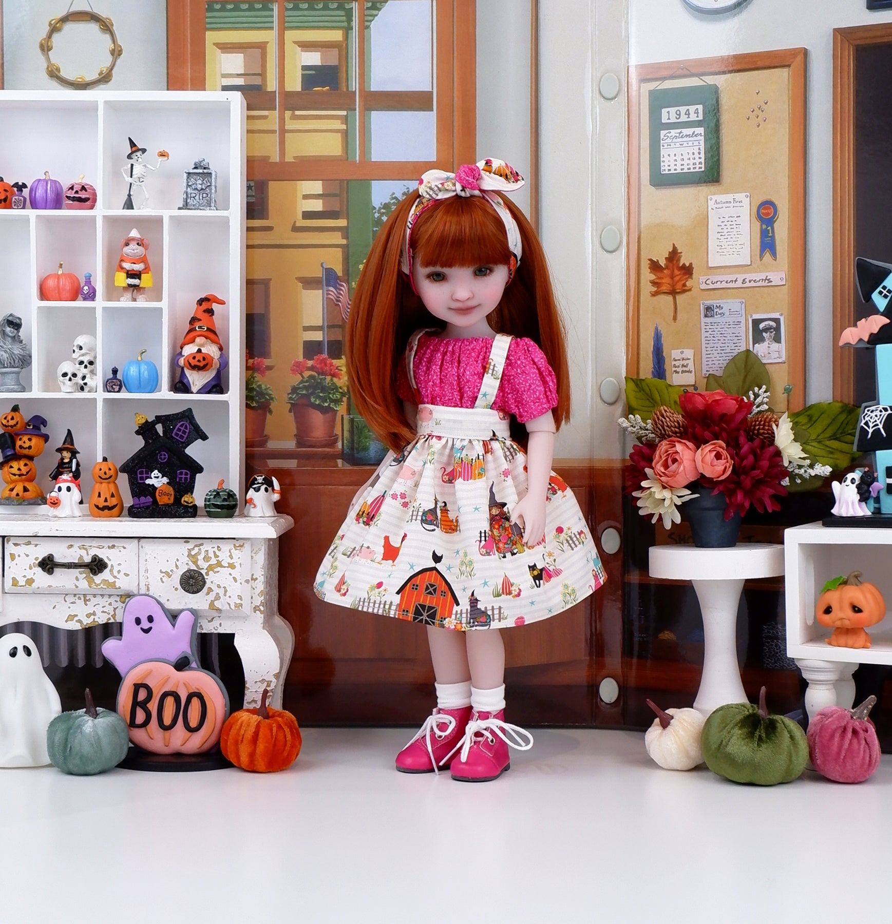 This darling ensemble will be a perfect addition to your Ruby Red Fashion Friend's wardrobe for celebrating this Halloween season. The peasant blouse is made of pretty fuchsia leaf print cotton. The blouse features elastic at the neckline for an over or across shoulder look. The short sleeves have elastic above the elbow. The shirt looks great bloused into the suspender jumper skirt. The jumper is made of a cute country Witch with barns, chickens, flowers and black cats in bright colors on grey stripe cotton. The skirt features straps that attach at the waist. The skirt fastens with a button covered snap at the waist band. Add the matching headband for a hair accessory. The retro style knot headband is made of Halloween barnyard & leaf print cottons and features elastic behind the neck for easy styling.