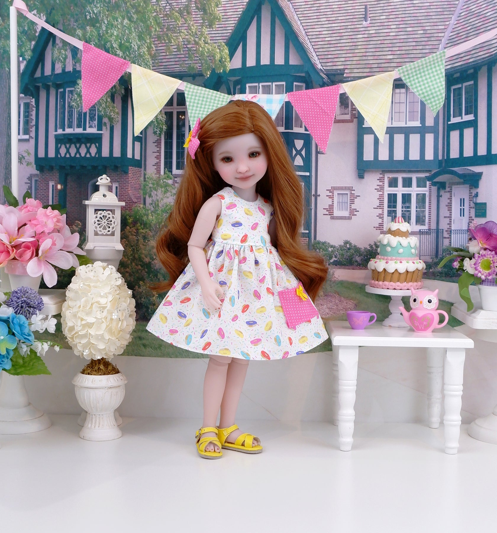 This darling babydoll dress ensemble is a great addition to any Ruby Red Fashion Friend's wardrobe. The dress is made of a yummy doughnut print with sprinkles in pink, aqua, blue, yellow and red on white cotton. The sleeveless bodice is fully lined with a babydoll waistline. The skirt is gathered at the waist for a pretty silhouette with a contrast pink polka dot print cotton pocket adorned with a yellow ribbon bow. The dress fastens in back with a button covered snap. Add the matching hair clip for an easy hairstyle. A pink polka dot print cotton fabric bow is adorned with a yellow ribbon bow.