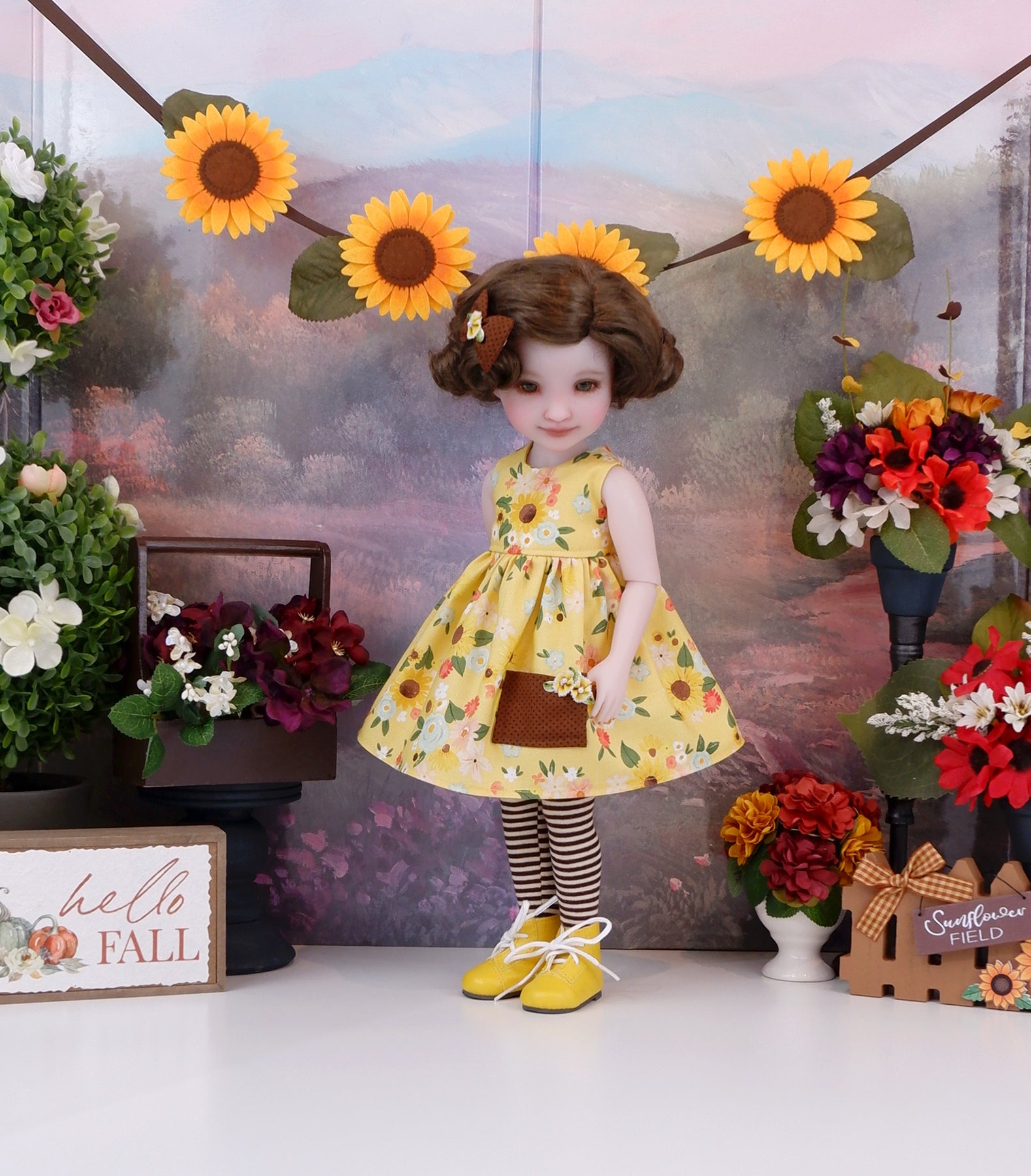 This cute babydoll dress ensemble is a great addition to any Ruby Red Fashion Friend's wardrobe. The dress is made of a charming sunflower print on yellow cotton. The sleeveless bodice is fully lined with a babydoll waistline. The skirt is gathered at the waist for a pretty silhouette with a contrast brown polka dot print cotton pocket adorned with two yellow ribbon flowers. The dress fastens in back with a button covered snap. Add the matching hair clip for an easy hairstyle. A brown polka dot print cotton fabric bow is adorned with a yellow ribbon flower.