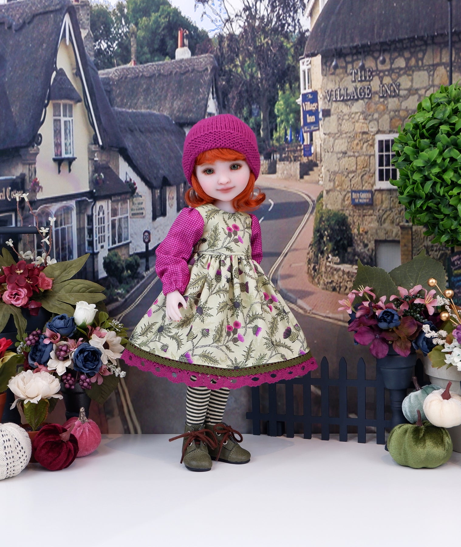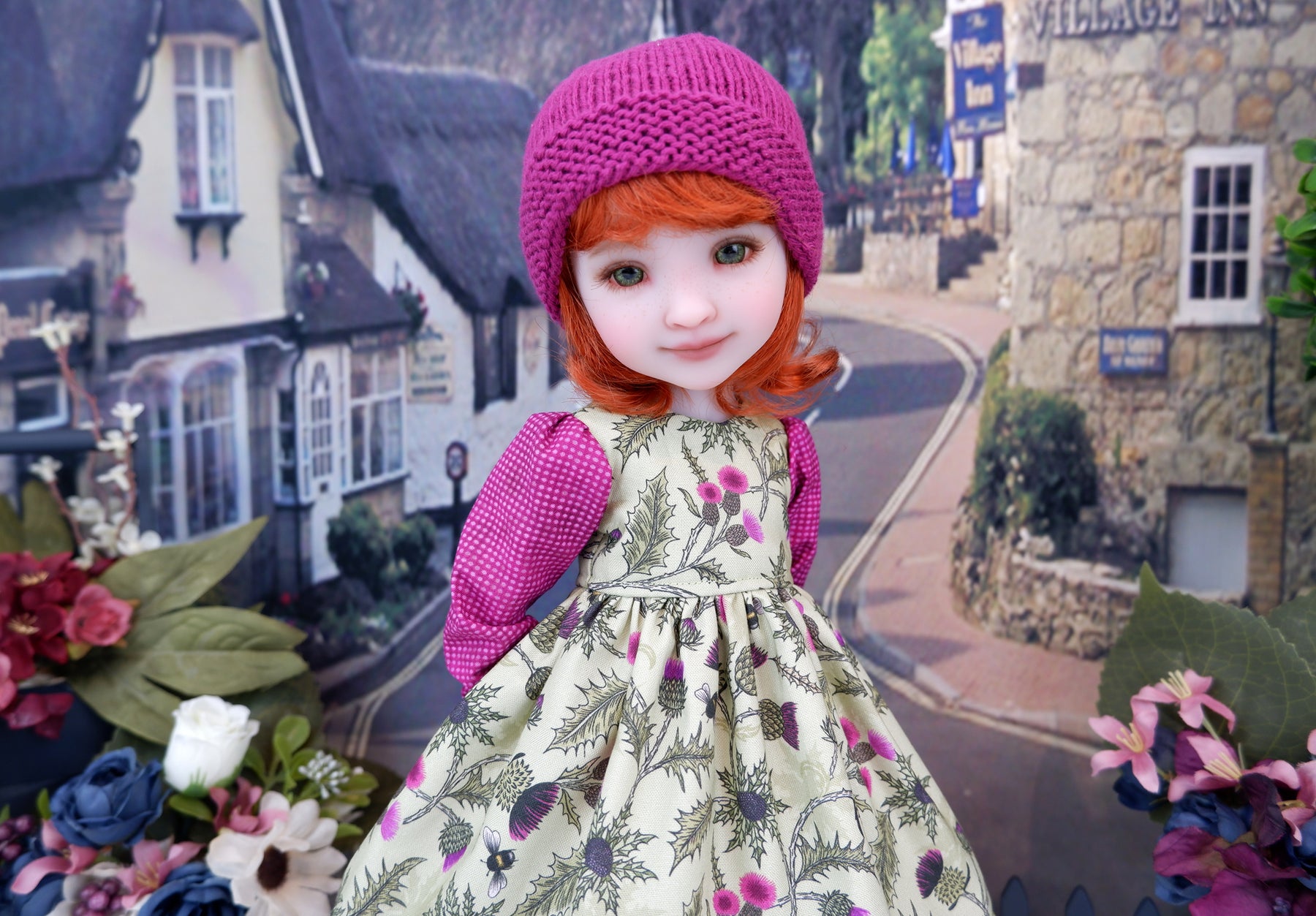 This gorgeous ensemble will be the perfect addition to your Fashion Friend's closet for Autumn weather. The dress is made of a beautiful thistle print in magenta and plum on light green cotton. The bodice is fully lined with contrast magenta dot print cotton full length long sleeves featuring a bit of elastic at the wrist. The skirt is gathered at the waist for a wonderful silhouette with loden green crochet lace over mulberry crochet lace peeking out beneath the hem. The dress fastens in back with buttons. To add to the charm of her outfit, she has a knit hat. Her knitwear is made of high quality magenta yarn.