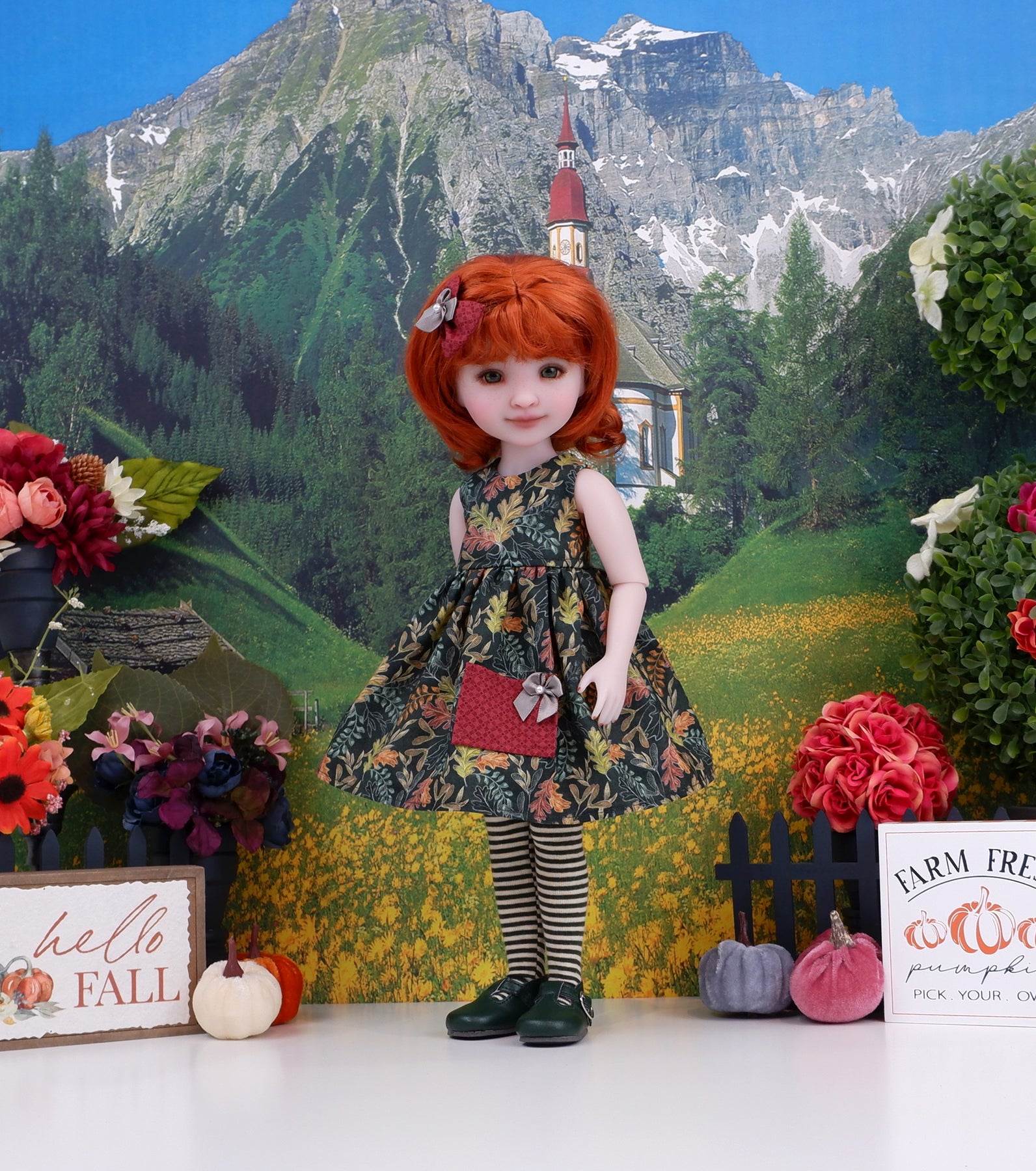 This charming babydoll dress ensemble is a great addition to any Ruby Red Fashion Friend's wardrobe for celebrating Fall. The dress is made of a lovely oak leaf print in cranberry, taupe, green and mustard on dark green cotton. The sleeveless bodice is fully lined with a babydoll waistline. The skirt is gathered at the waist for a pretty silhouette with a contrast cranberry lattice print cotton pocket adorned with a taupe ribbon bow. The dress fastens in back with a button covered snap. Add the matching hair clip for an easy hairstyle. A cranberry lattice print cotton fabric bow is adorned with a taupe ribbon bow.