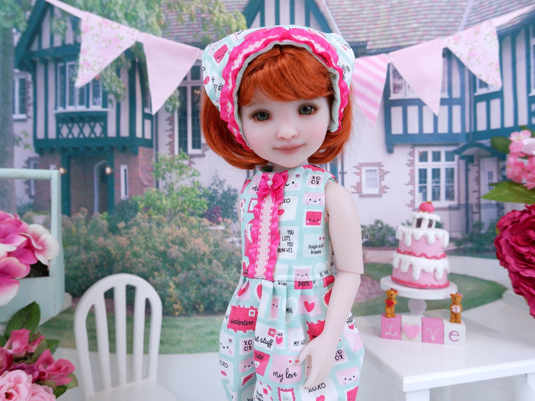This darling romper ensemble is a great addition to any Ruby Red Fashion Friend's wardrobe for Valentine's Day. The romper is made of a sweet love letter print in pink, white and fuchsia on seafoam cotton. The sleeveless bodice is fully lined with a faux placket down the front with ruffled fuchsia ribbon beneath pink stitched ribbon. The pants are gathered at the waist and gathered to a band adorned with ruffled fuchsia ribbon just below the knee. The romper fastens in back with buttons. Finish the look off with the matching kerchief. The kerchief is made of letter print cotton, adorned with fuchsia ruffled ribbon beneath pink stitched ribbon The kerchief features elastic in back for an easy on and off style.