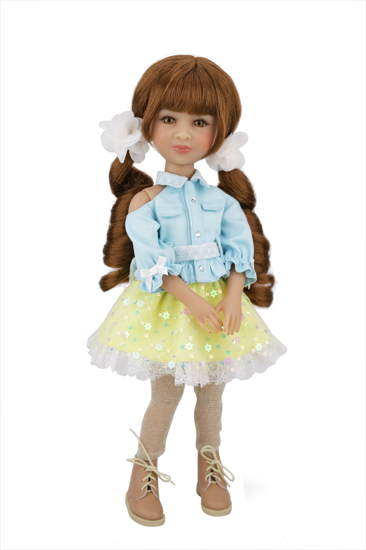 Valeria also dazzles in a fabulous skirt, featuring a top layer of tulle sprinkled with sequins, including cute flower-shaped ones! Underneath, she flaunts a layer of sunny yellow denim, complete with a lovely lace trim.