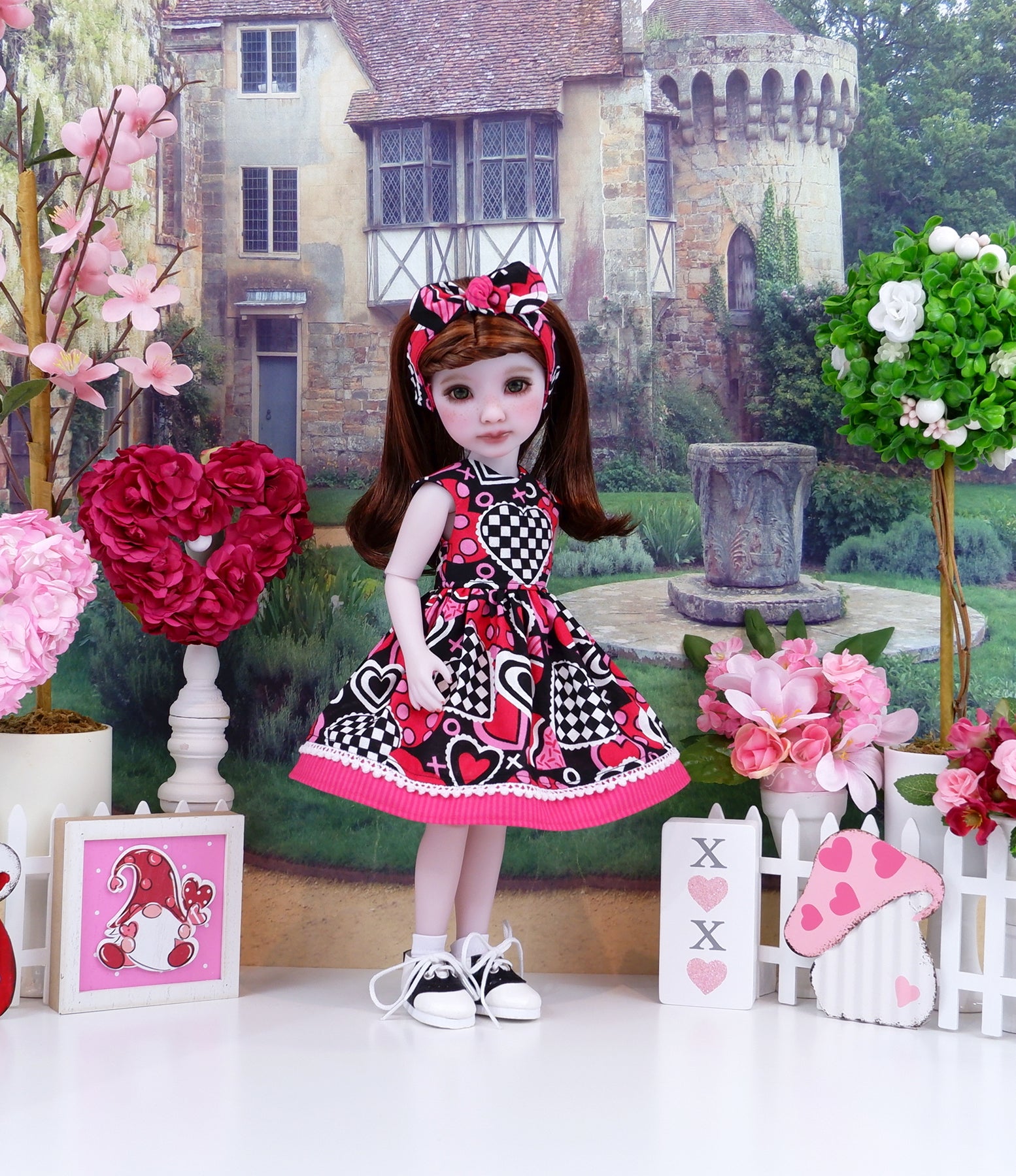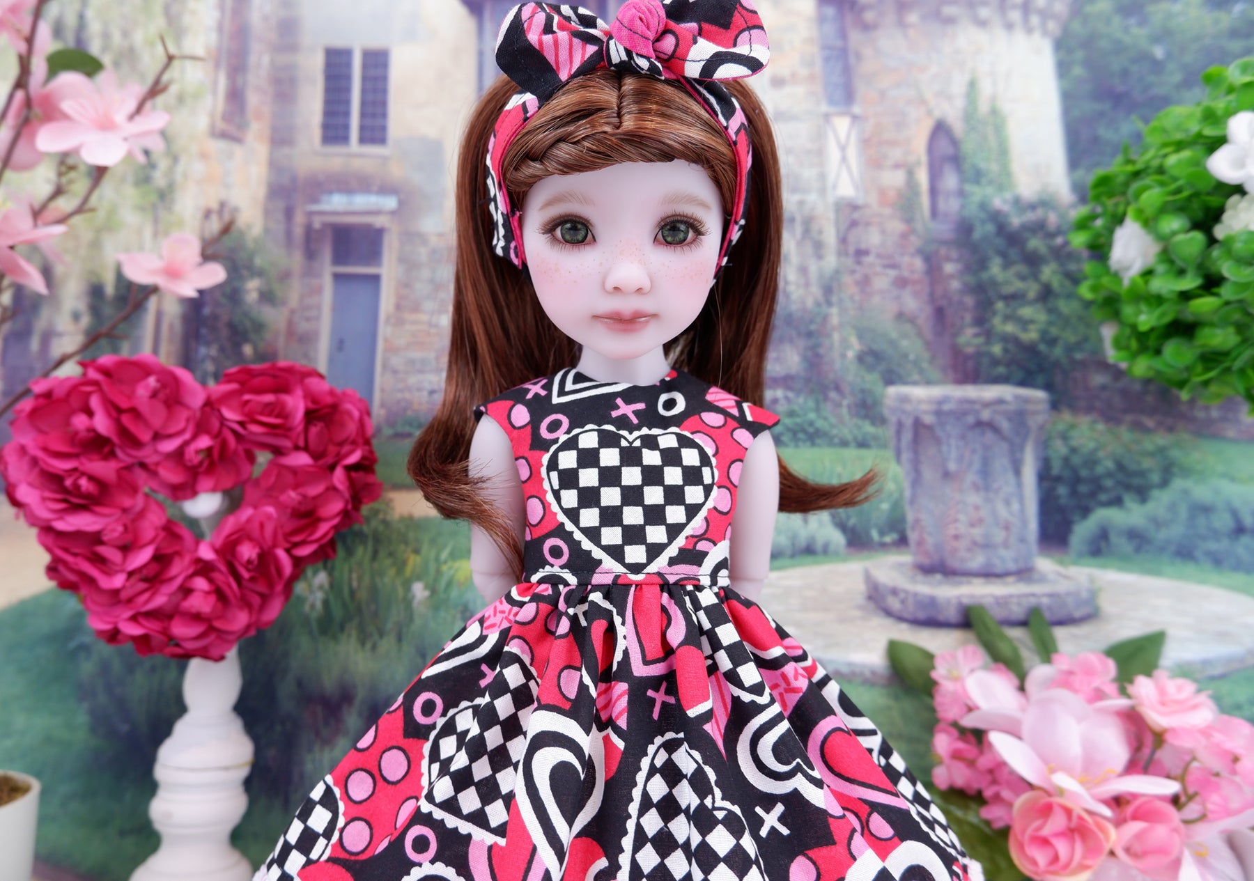 This delightful dress ensemble is a great addition to any Ruby Red Fashion Friend's wardrobe for this Valentine's Day. The dress is made of a darling black chess board heart with red and fuchsia hearts on black cotton. The fully lined bodice features a cap sleeve. The skirt is full and gathered at the waist for a wonderful silhouette with white pom pom trim above the contrast fuchsia stripe print cotton at the hem. The dress fastens in back with buttons. Add the matching headband for a hair accessory. The retro style knot headband is made of heart & stripe print cottons and features elastic behind the neck for easy styling.