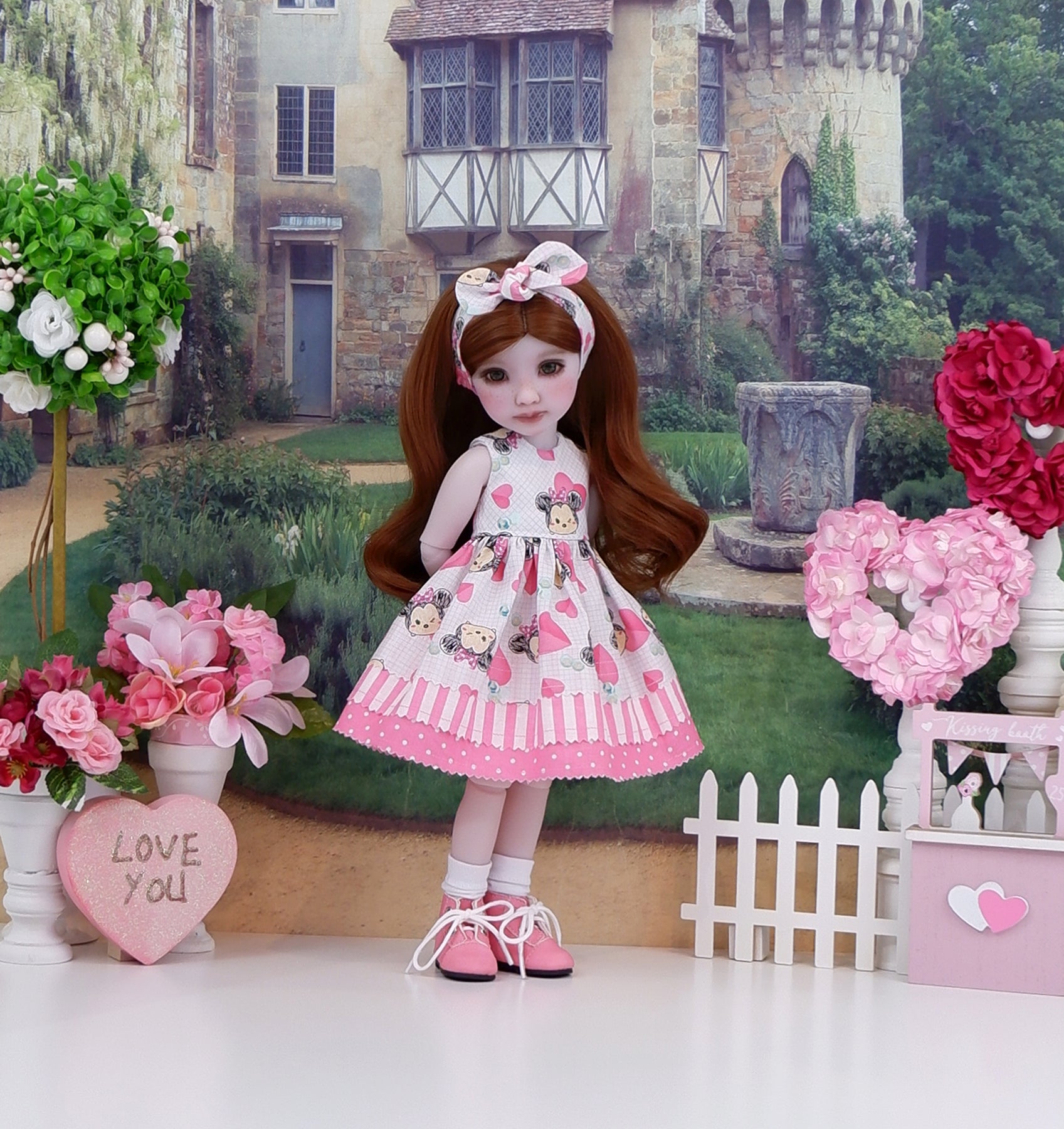 Matte pink lace up ankle boots with white knee high socks are included to complete the ensemble. The socks are made by Wendy at Doll Secrets.