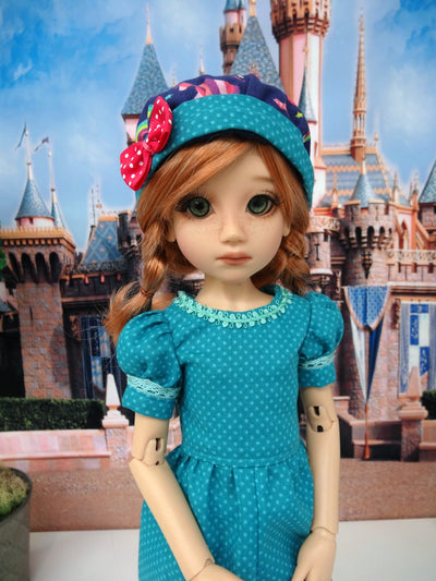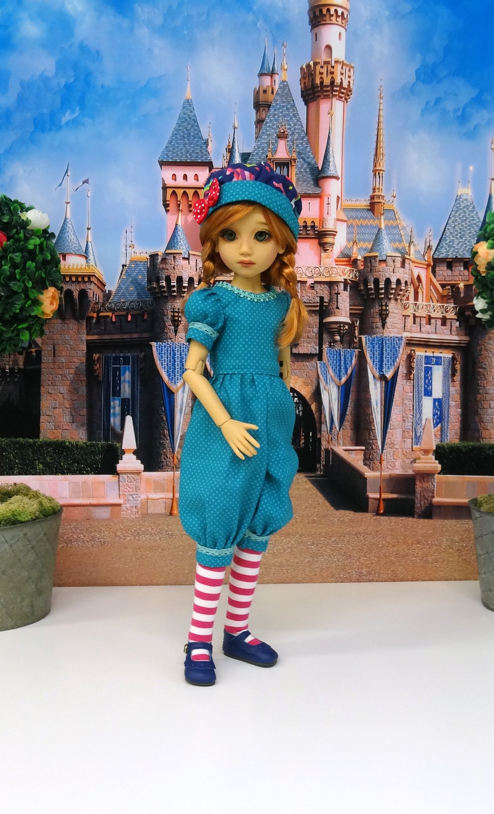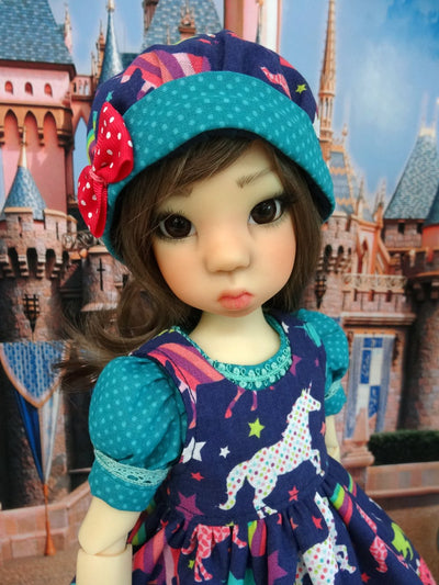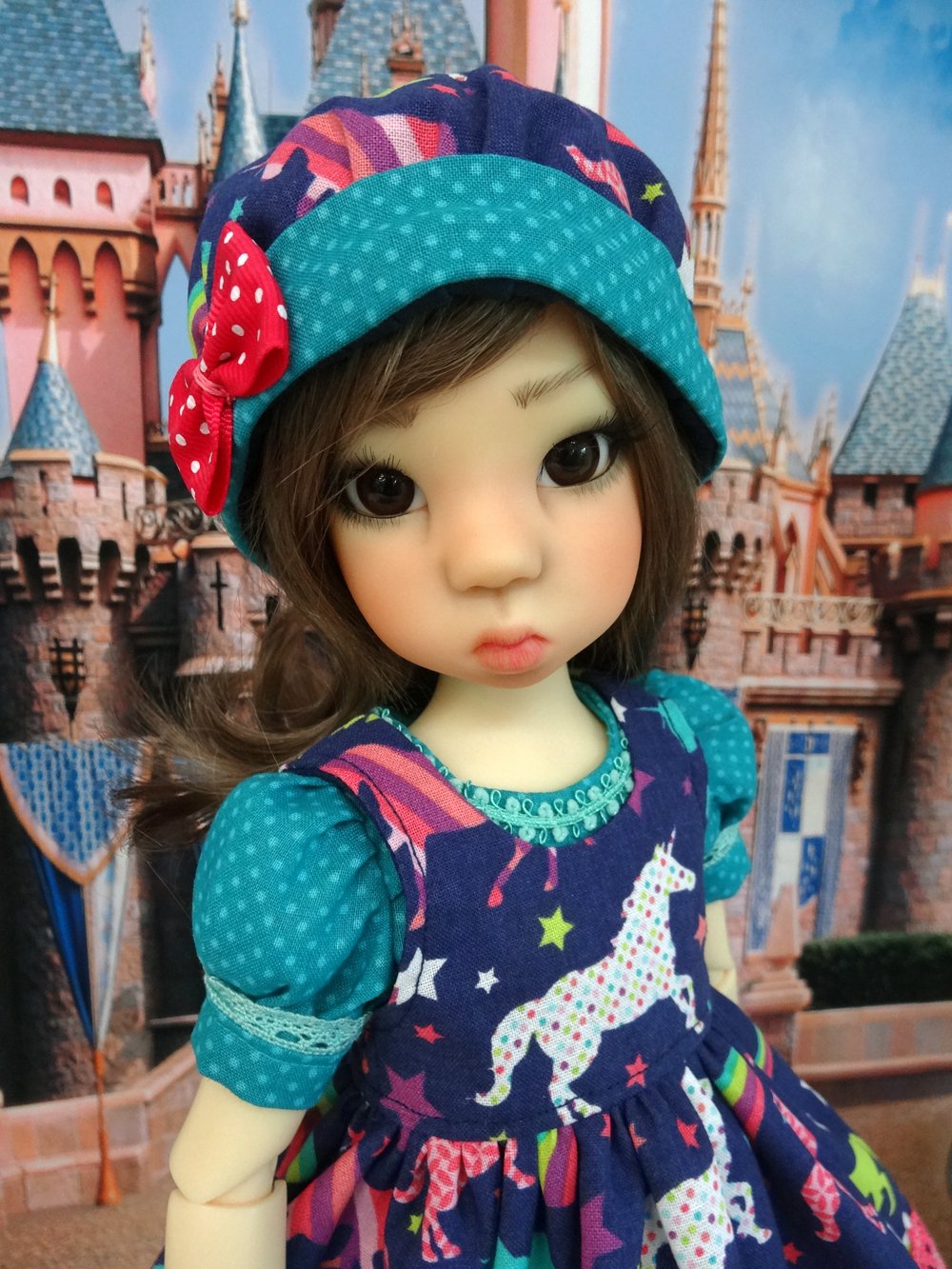 This cute ensemble is a great addition to your favorite 45cm BJD wardrobe. The jumper is made of a darling unicorn print in bright colors with rainbows on navy blue cotton. The sleeveless bodice is fully lined with a scoop neckline. The skirt is gathered at the waist with pink and rainbow crochet lace trim and navy rick rack at the hemline. A fuchsia polka dot ribbon bow adorns the hem.  The jumper fastens in back with buttons.  Beneath her jumper she wears a coordinating romper.  The romper is made of aqua and teal polka dot cotton.  The fully lined bodice is detailed with a bit of aqua trim around the neckline.  The short sleeves are trimmed with aqua crochet lace at the band above the elbow.  The bottoms are gathered at the waist and banded at the knee with aqua crochet lace peeking out above the band.  The romper fastens in back with buttons.  Finish the look with the matching hat.  The hat is made of unicorn print gathered to a hat band of aqua and teal polka dot cotton.  A fuchsia polka dot ribbon bow embellishes the hat brim.
