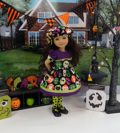 This adorable dress is the perfect addition to any Fashion Friend's wardrobe for Halloween. The dress is made of a frightful Halloween print with black cats, skeletons, ghosts, spiders and Frankenstein in purple. green, apple green, orange, magenta and white on black cotton. The fully lined bodice is made of purple striped print cotton with a contrast overlay of Halloween print at the waist trimmed with apple green polka dot print cotton contrast bias trim. The short sleeves are also made of stripe print cotton with polka dot print contrast at the Halloween print sleeve bands above the elbow. The skirt is full and gathered at the waist for a wonderful silhouette with an inset of apple green polka dot print cotton above the contrast purple stripe print cotton band at the hem. The dress fastens in back with buttons. Finish the look off with the matching hat. The fully lined beret is made of Halloween print cotton with a layered apple green and purple ribbon bow embellishing the hat brim.