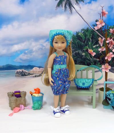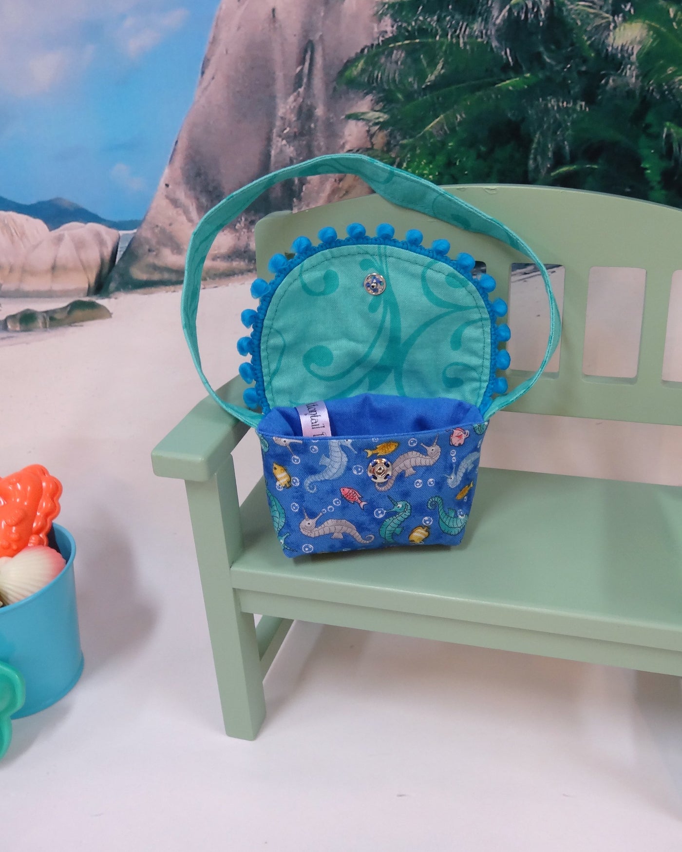 This darling romper is the perfect addition to any Fashion Friend's wardrobe. The romper is made of a precious seahorse print in green, grey, yellow and coral on blue cotton. The fully lined bodice has tiny contrast seafoam green swirl print straps at the shoulders and is fully lined. The contrast waistband is made of seafoam green swirl print cotton. The pants feature contrast working pockets in swirl print and have elastic at the cuffs at the knee. The romper fastens in back with buttons. Finish the look off with the coordinating kerchief. The kerchief is made of seafoam green swirl print cotton, adorned with rows of blue pom pom and seafoam green ruffled trims with two aqua sequin flowers. The kerchief features elastic in back for an easy on and off style. Added to this adorable ensemble is her fabric purse. The purse is made of seahorse and swirl cottons adorned with blue pom pom trim and is fully lined. A button covered snap secures the front flap.