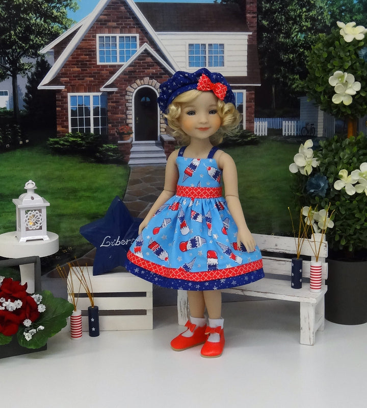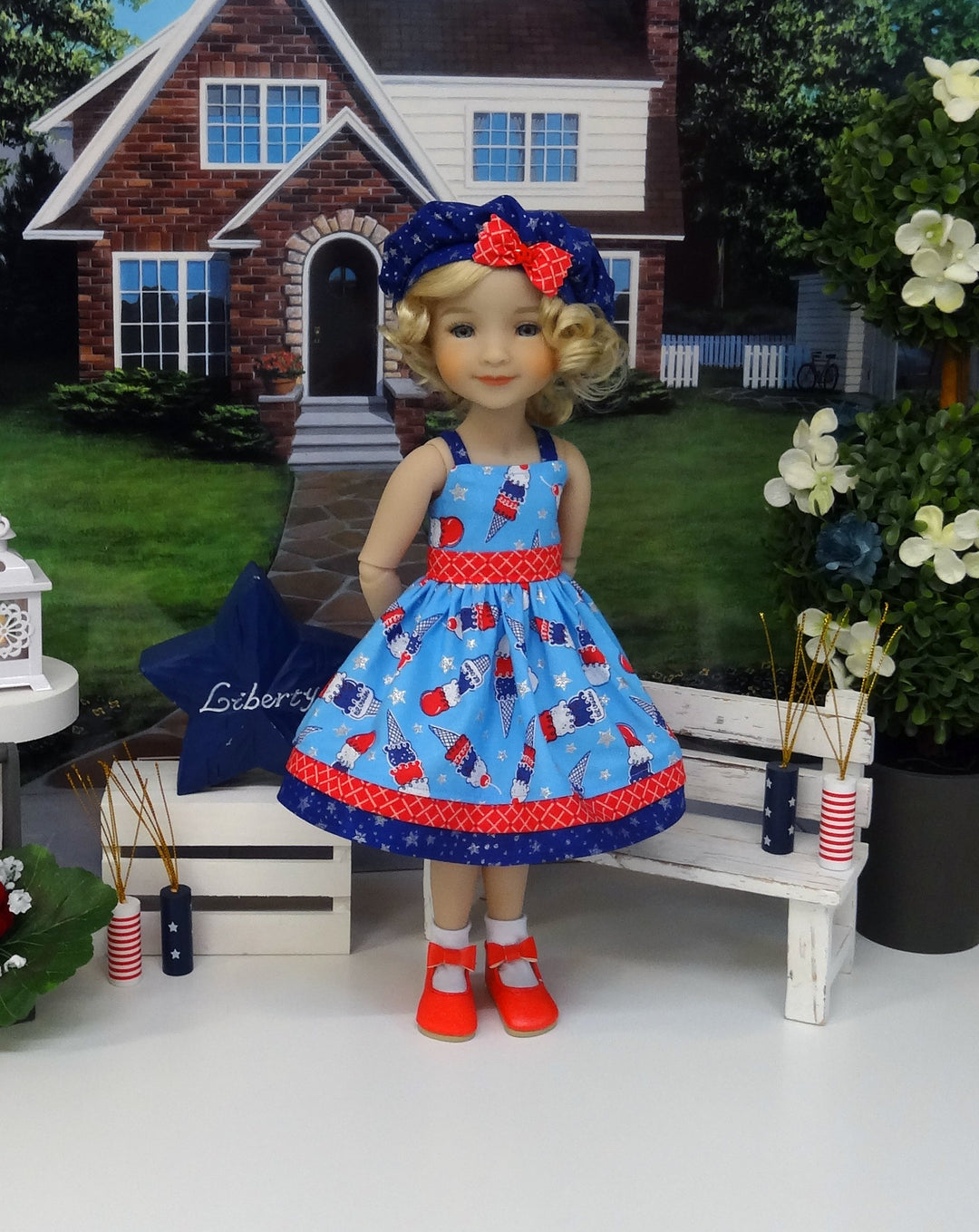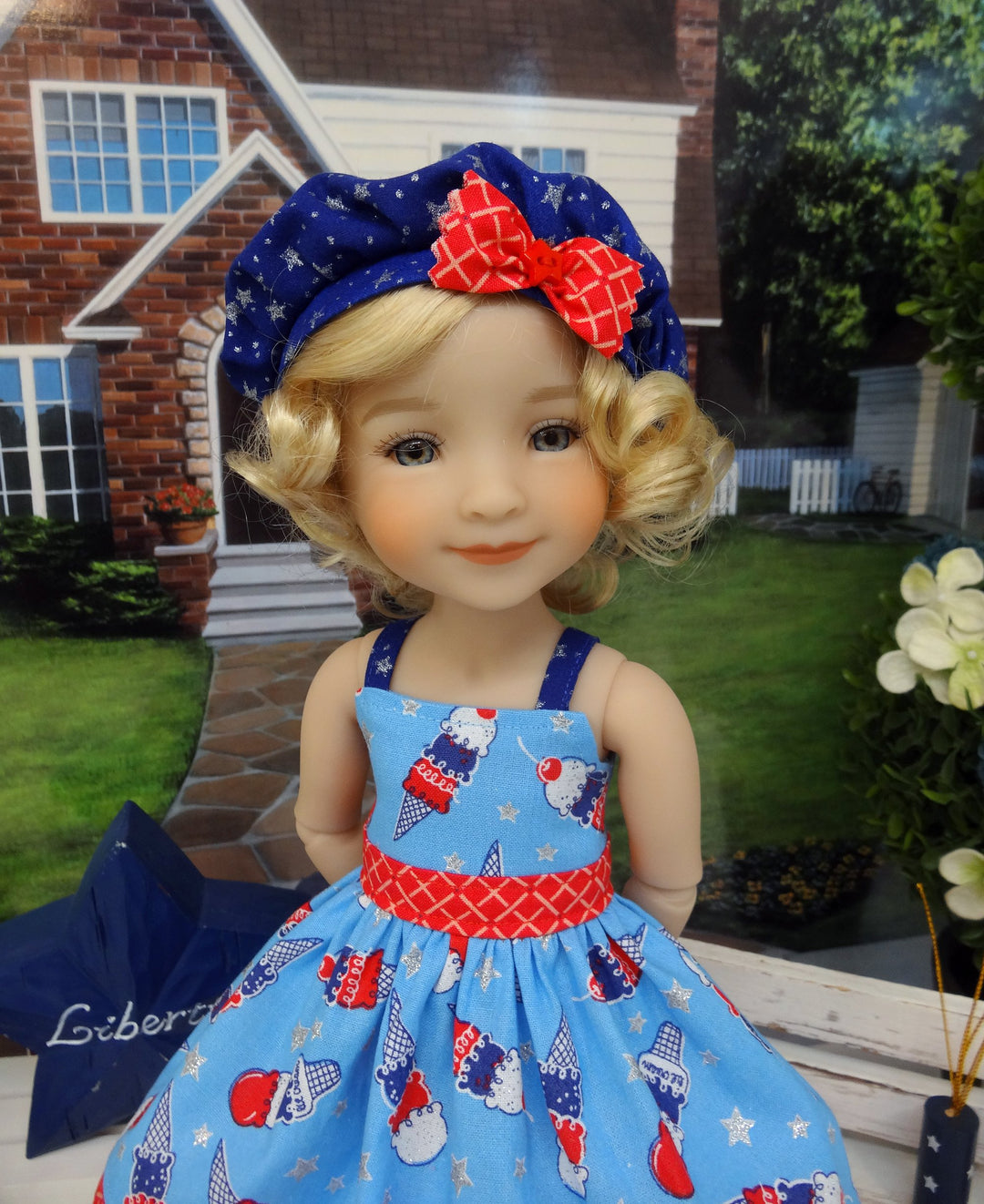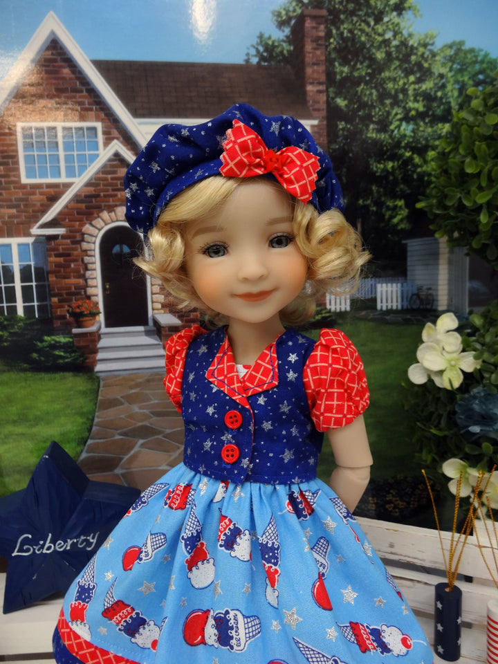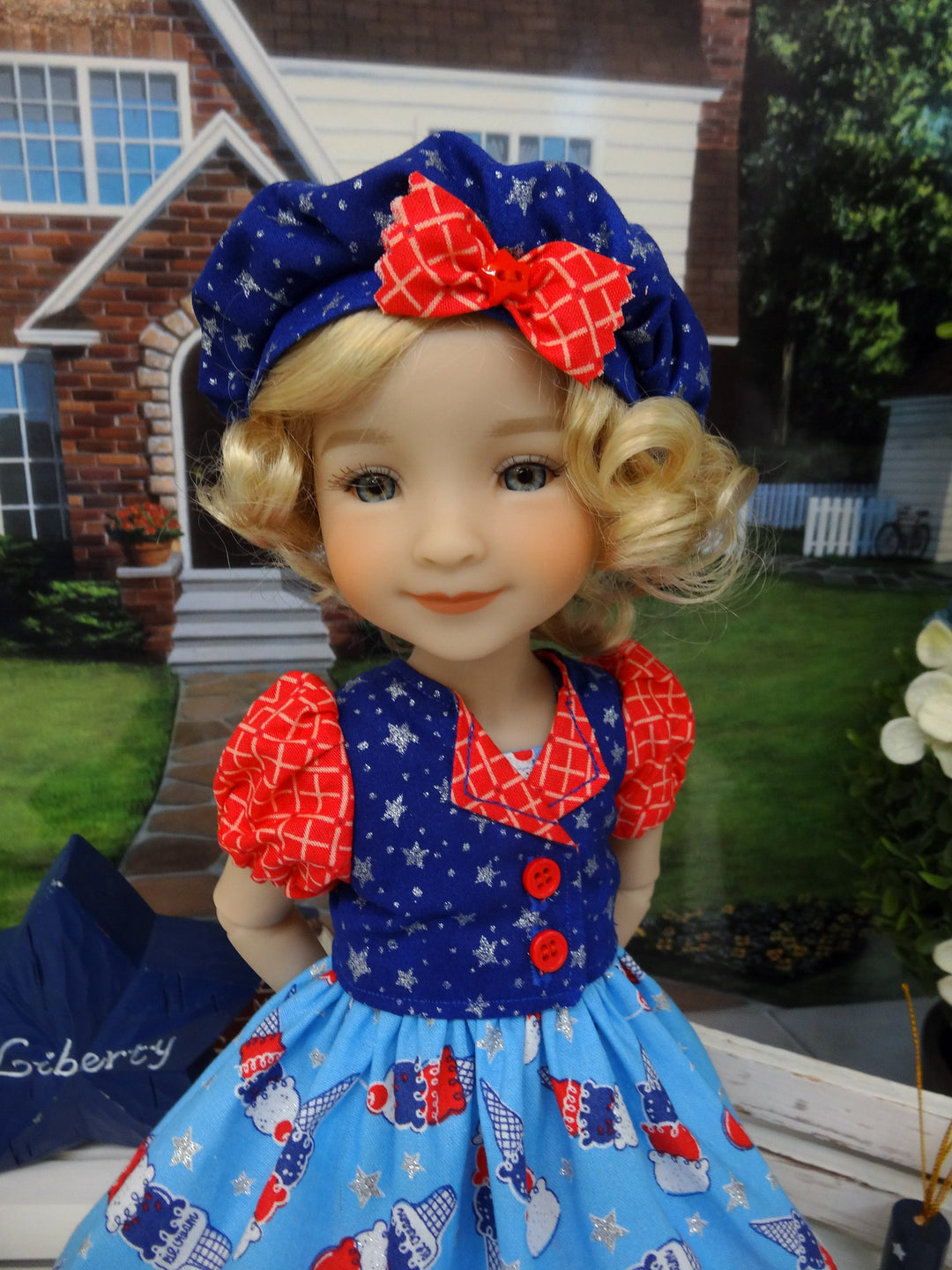 This adorable sundress ensemble is a great addition to any Ruby Red Fashion Friend's wardrobe to celebrate Independence Day. The dress is made of a charming ice cream cone print in red white and blue with silver stars on sky blue cotton. The bodice has tiny contrast silver star on blue cotton print straps at the shoulders and is fully lined. A contrast waistband is made of red lattice print cotton. The skirt is full and gathered at the waist for a wonderful silhouette with an inset of red lattice print cotton above the contrast silver star on blue cotton band at the hem. The dress fastens in back with buttons. Pair with the coordinating jacket. The jacket is made of silver star print on blue cotton and fully lined in red lattice print cotton. The jacket features turned lapels to reveal the contrast lining underneath. The short sleeves are also made of lattice print featuring a bit of elastic above the elbow. The jacket fastens in front with little buttons. Complete this cute outfit with the matching beret. The beret is fully lined and made of silver star print on blue cotton with a contrast lattice print fabric bow anchored with a red star button on the hat band.