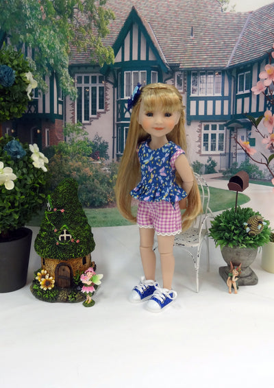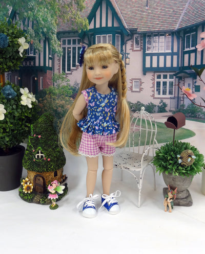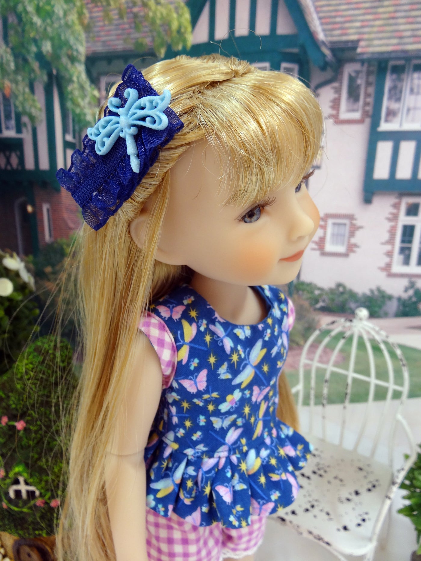 This sweet layered ensemble is a great addition to any Ruby Red Fashion Friend's wardrobe. The top is made of a charming dragonfly print in aqua, lavender, yellow and orchid on dark blue cotton. The sleeveless bodice is fully lined and features contrast orchid gingham bias at the armscye. The peplum is gathered at the hem with a delicate rounded edge in back. The top fastens in back with buttons. Beneath her top she wears a pair of coordinating shorts. The shorts are made from orchid gingham print cotton with contrast dragonfly fabric working pockets. Top stitching to create a faux fly and dainty white crochet lace add to the charm. The shorts feature elastic at the waist for easy dressing. Add the hairclip for a sweet and simple hairstyle. The hairclip is covered with navy blue ruffled ribbon beneath an enchanting light blue dragonfly charm.