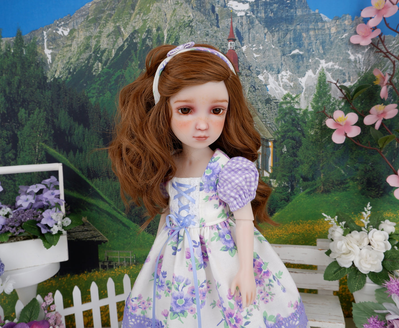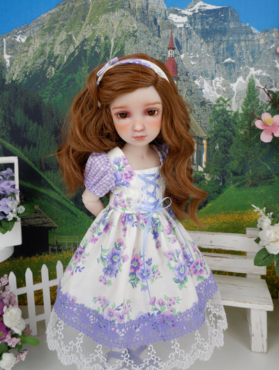 This precious dress is the perfect Bavarian style addition to any Fashion Friend's wardrobe.  The dress is made of a beautiful purple and lavender floral print on white cotton.  The fully lined bodice features white floral print cotton beneath floral print overlays trimmed with white crochet lace.  Lavender ribbon is laced through the crochet lace to create a dirndl appearance.  The short sleeves are made of lavender gingham print cotton and have a bit of elastic above the elbow.  The skirt is full and gathered at the waist with lavender crochet lace over delicate white embroidered lace peeking out beneath the hemline.  The dress fastens in back with buttons.  Add the matching headband to finish the look.  The wire frame headband is covered with floral print cotton embellished with a purple gingham ribbon bow.