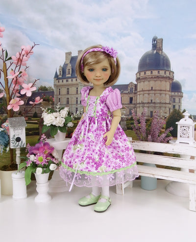 This gorgeous dress is the perfect Bavarian style addition to any Fashion Friend's wardrobe. The dress is made of a beautiful geranium print in orchid and lilac purple one white cotton. The fully lined bodice features lavender medallion print cotton beneath floral print overlays trimmed with spring green crochet lace. Lavender ribbon is laced through the spring green crochet lace to create a dirndl appearance. The short sleeves are made of medallion print cotton and have a bit of elastic above the elbow. The skirt is full and gathered at the waist with spring green crochet lace over lavender embroidered lace peeking out beneath the hemline. The dress fastens in back with buttons. Add the matching headband to finish the look. The wire frame headband is covered with floral print cotton embellished with two lavender ribbon flowers.