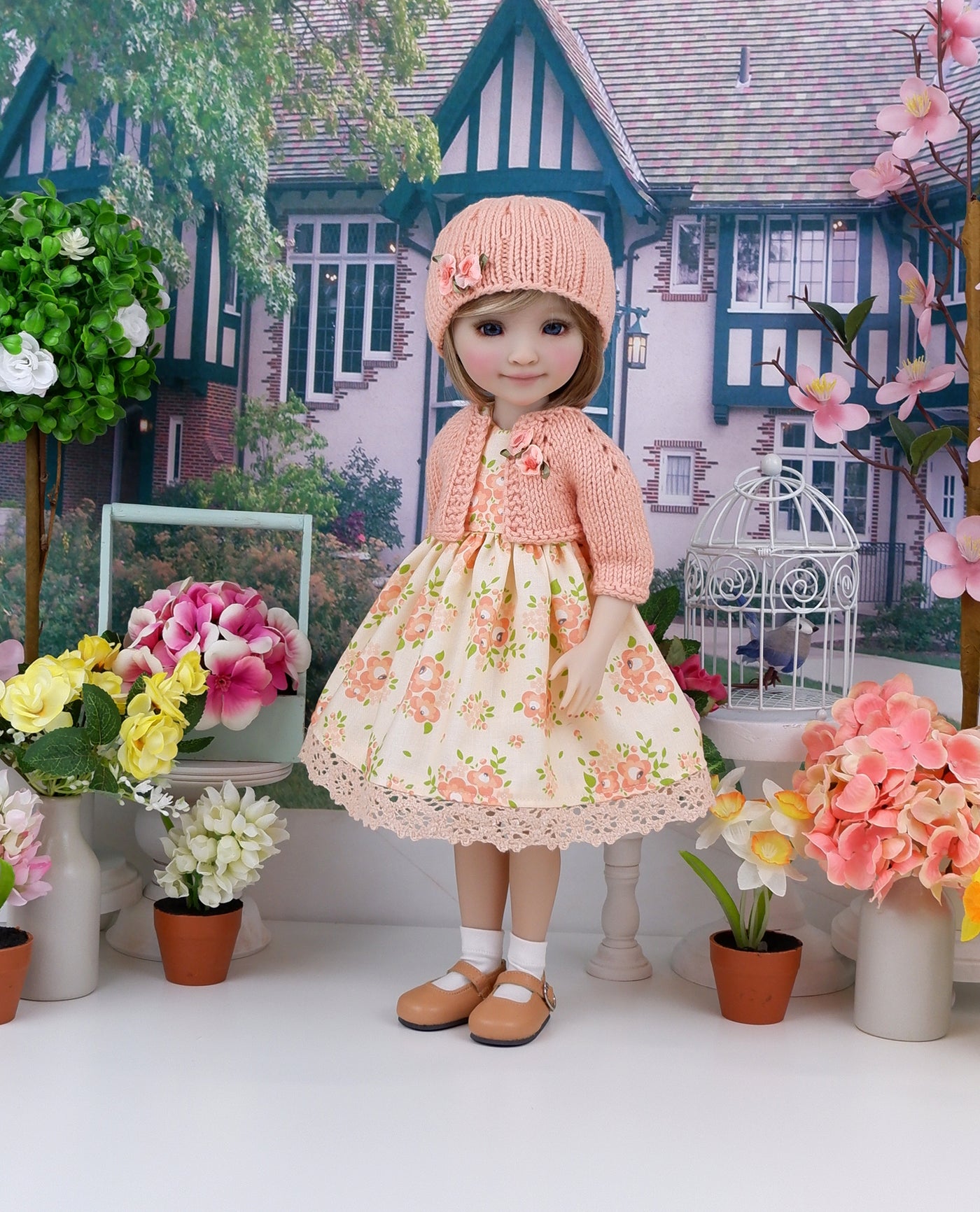 This beautiful dress and sweater ensemble is the perfect addition to your Fashion Friend's wardrobe. The dress is made of a precious peach floral print on pale peach cotton. The sleeveless bodice is fully lined with a higher waistline. The skirt is gathered at the waist for a pretty silhouette with pale peach crochet lace peeking out beneath the hem. The dress fastens in back with buttons. Wear the dress alone or pair with the coordinating sweater. The sweater is made of high quality peach yarn with 3/4 sleeves and two variegated peach ribbon flowers on one lapel. Complete the look with the matching hat. The hat is also made of peach yarn featuring two peach ribbon flowers on the edge.