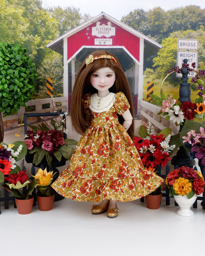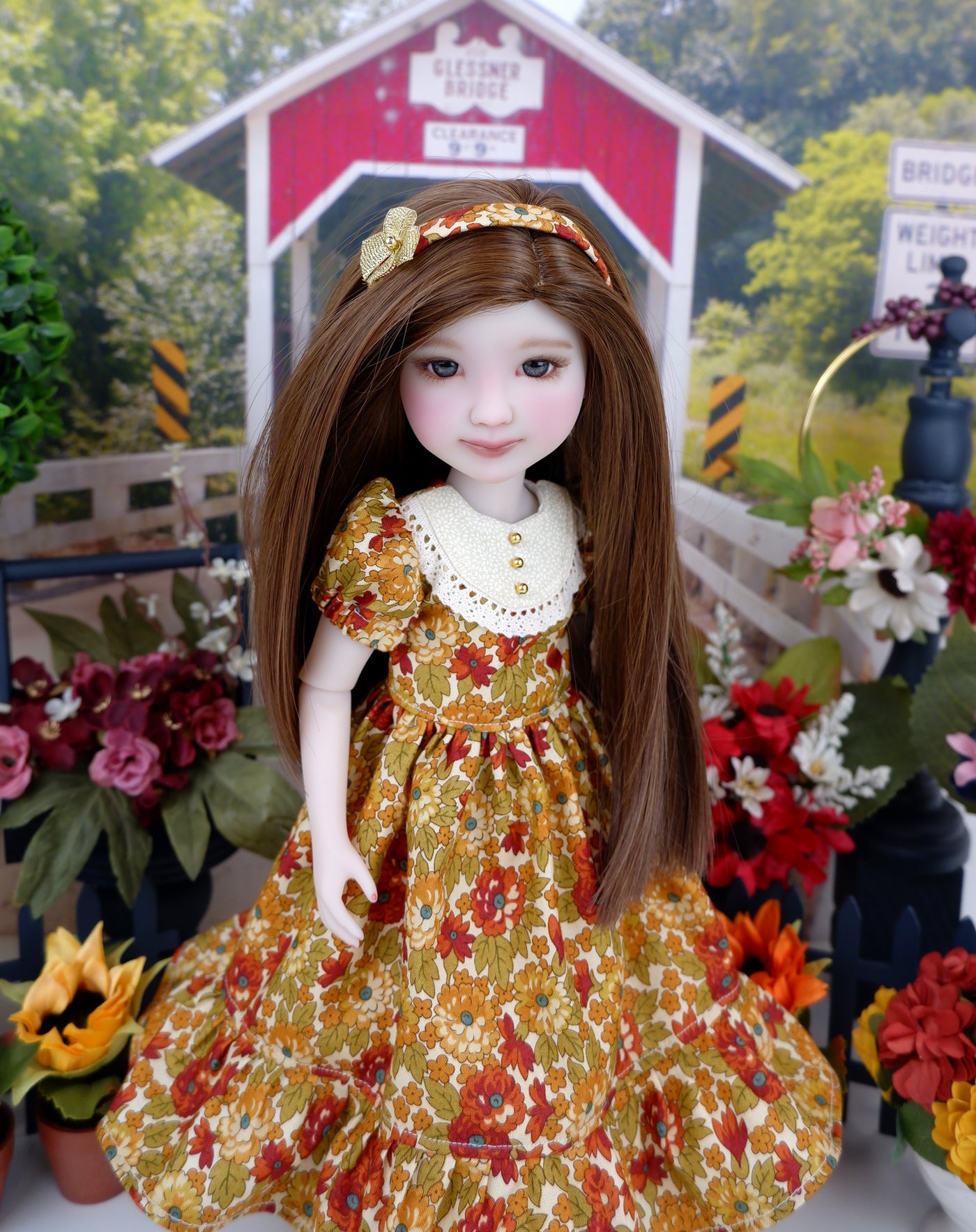 This beautiful classic dress ensemble is a great addition to any Ruby Red Fashion Friend's wardrobe for this Autumn season. The dress is made of a beautiful floral print in brick, marigold and loden green on ivory cotton. The fully lined bodice features a bib overlay of ivory leaf print cotton trimmed with ivory crochet lace. Three tiny gold beads adorn the bodice. The short gathered sleeves have a bit of elastic above the elbow. The maxi length skirt is full and gathered at the waist with a self ruffle at the hem. The dress fastens in back with buttons. Add the matching headband to finish the look. The wire frame headband is covered with floral print cotton embellished with a gold ribbon bow.